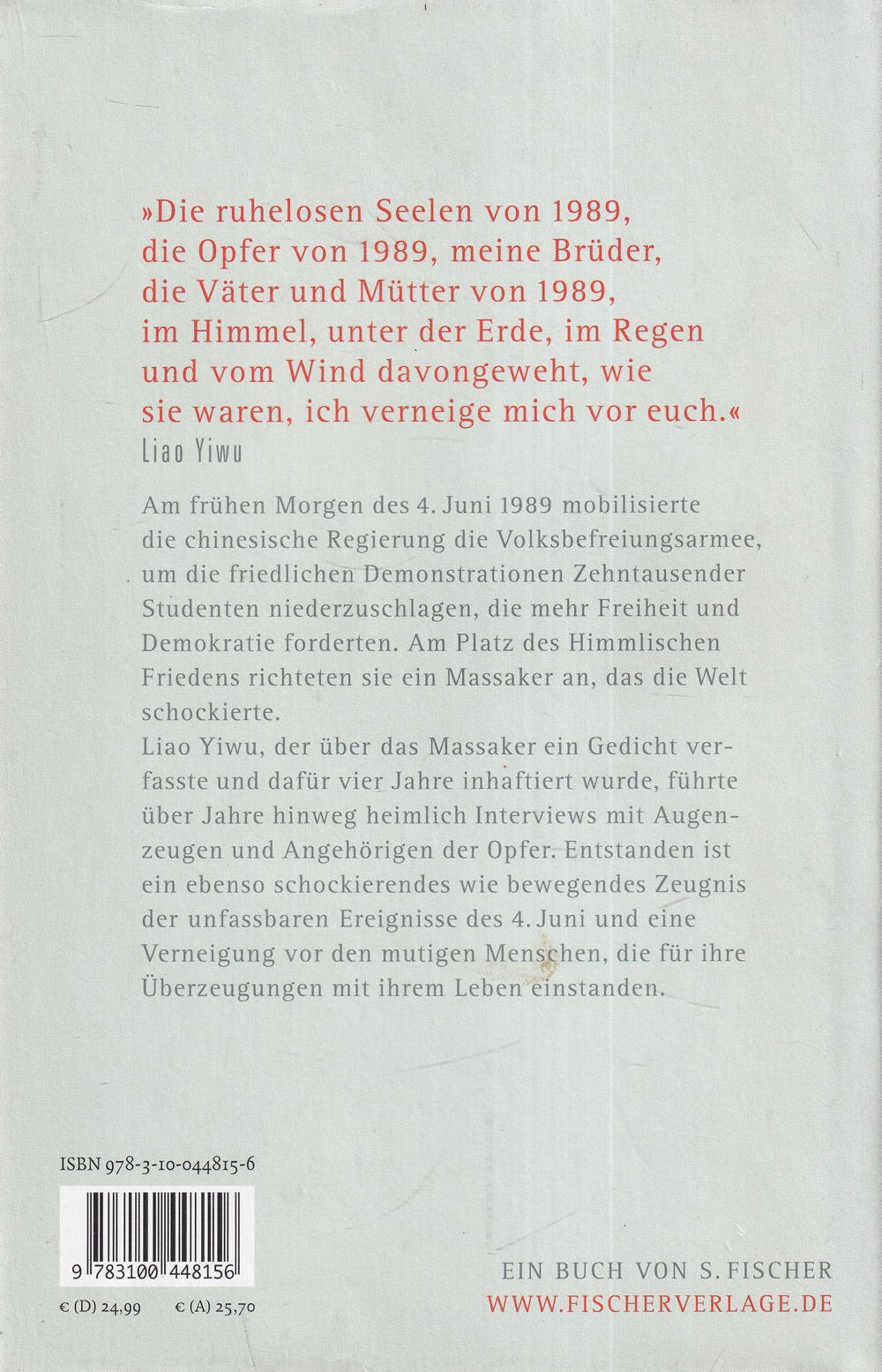 Liao Yiwu, der über das Massaker ein Gedicht verfasste und dafür vier Jahre inhaftiert wurde, führte über Jahre hinweg heimlich Interviews mit Augenzeugen und Angehörigen der Opfer. Entstanden ist ein ebenso schockierendes wie bewegendes Zeugnis der unfassbaren Ereignisse vom 4. Juni und eine Verneigung vor den mutigen Menschen, die für ihre Überzeugungen mit ihrem Leben einstanden.