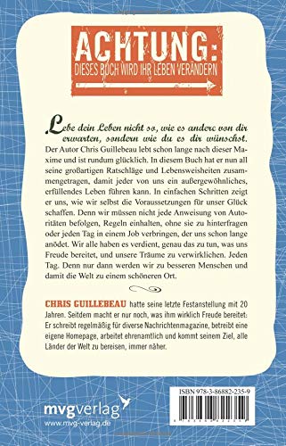Chris Guillebeau scheint alles richtig gemacht zu haben: Er liebt sein Leben und tut jeden Tag genau das, was ihm Spass macht. Schon früh hat er begriffen, dass es im Leben wichtigere Dinge gibt als Geld. Mit 20 hatte er seine letzte Festanstellung, seitdem arbeitet er freiberuflich in den verschiedensten Berufen - er verkaufte Kaffee, designte Websites, war Amateurmusiker. Zwischenzeitlich verbrachte er vier Jahre als freiwilliger Helfer in Afrika. Neben der Arbeit an seiner eigenen Homepage findet er jedes Jahr Zeit für seine grosse Leidenschaft: das Reisen. Gemäss seinem Credo "Verbessere dein eigenes Leben und gestalte damit die Welt positiver" lebt er die Philosophie seines Buches. In diesem hat er all seine grossartigen Ratschläge, praktischen Tipps und Lebensweisheiten zusammengetragen, damit jeder von uns ein aussergewöhnliches, erfüllendes Leben führen kann. Denn gegen den Strom zu schwimmen kann manchmal sehr befreiend sein. Wir müssen nicht alle Anweisungen von Autoritäten befolgen, Regeln einhalten, ohne sie zu hinterfragen, oder jeden Tag in einem Job verbringen, der uns schon lange anödet. Wir alle haben es verdient, genau das zu tun, was uns Freude bereitet, und unsere Träume zu verwirklichen. Jeden Tag. Denn nur dann werden wir zu besseren Menschen und die Welt zu einem besseren Ort. Und genau das lernen wir mit diesem Buch.