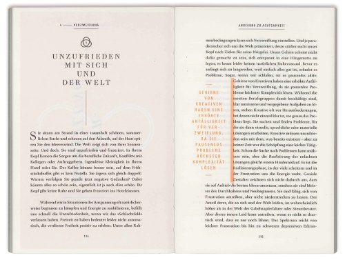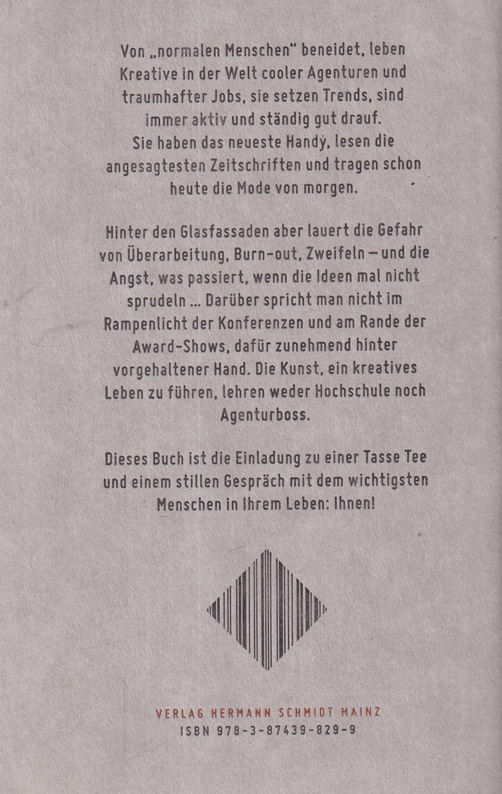 Von normalen Menschen beneidet, leben Kreative in der Welt cooler Agenturen und traumhafter Jobs, sie setzen Trends und sind immer aktiv und ständig gut drauf. Sie haben das neueste Handy, lesen die angesagtesten Zeitschriften und tragen schon heute die Mode von morgen. Hinter den Glasfassaden aber, lauert die Gefahr von Überarbeitung, Burnout, Zweifeln und die Angst was passiert, wenn die Ideen mal nicht sprudeln... Darüber spricht man nicht im Rampenlicht der Konferenzen und am Rande der Awardshows, dafür zunehmend hinter vorgehaltener Hand. Die Kunst, ein kreatives Leben zu führen lehren weder Hochschule noch Agenturboss. Dieses Buch ist die Einladung zu einer Tasse Tee und einem stillen Gespräch mit dem wichtigsten Menschen in Ihrem Leben: Ihnen!