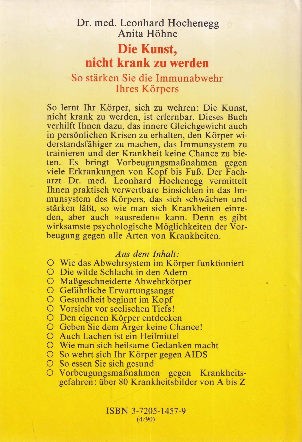 So lernt Ihr Körper, sich zu wehren: Die Kunst, nicht krank zu werden, ist erlernbar. Dieses Buch verhilft Ihnen dazu, das innere Gleichgewicht auch in persönlichen Krisen zu erhalten, den Körper widerstandsfähiger zu machen, das Immunsystem zu trainieren und der Krankheit keine Chance zu bieten. Es bringt Vorbeugungsmassnahmen gegen viele Erkrankungen von Kopf bis Fuss. Der Facharzt Dr. Med. Leonhard Hochenegg vermittelt Ihnen praktisch verwertbare Einsichten in das Immunsystem des Körpers, das sich schwächen und stärken lässt, so wie man sich Krankheiten einreden, aber auch »ausreden« kann. Denn es gibt wirksamste psychologische Möglichkeiten der Vorbeugung gegen alle Arten von Krankheiten.