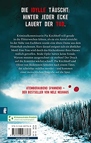 Die Idylle täuscht: Hinter jeder Ecke lauert der Tod. Kriminalkommissarin Pia Kirchhoff will gerade in die Flitterwochen fahren, als sie ein Anruf erreicht: In der Nähe von Eschborn wurde eine ältere Dame aus dem Hinterhalt erschossen. Kurz darauf ereignet sich ein ähnlicher Mord: Eine Frau wird durch das Küchenfenster ihres Hauses tödlich getroffen. Beide Opfer hatten keine Feinde. Warum mussten ausgerechnet sie sterben? Der Druck auf die Ermittler wächst schnell. Pia Kirchhoff und Oliver von Bodenstein fahnden nach einem Täter, der scheinbar wahllos mordet – und kommen einer menschlichen Tragödie auf die Spur. Atemberaubend spannend – der neue Bestseller von Nele Neuhaus!