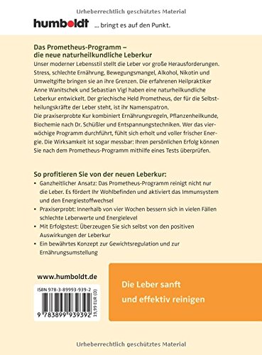 entgiftet pure Wellness! Wer das vierwöchige Programm durchführt, fühlt sich erholt und voller frischer Energie. Die Wirksamkeit ist sogar messbar: Den persönlichen Erfolg des Prometheus-Programms können Leser mithilfe eines Tests überprüfen. Auf den Punkt gebracht: -Rund 5 Mio. Menschen in Deutschland sind von Lebererkrankungen betroffen. -Ganzheitlicher Ansatz: Das Prometheus-Programm kombiniert Pflanzenheilkunde mit Entspannungstechniken und wurde von Heilpraktikern entwickelt. -Praxiserprobt: Innerhalb von vier Wochen bessern sich Leberwerte und Energielevel. -Mit Erfolgstest: Leser können sich von den positiven Auswirkungen der Leberkur auf ihren Körper und ihre Seele überzeugen. -Ein bewährtes Konzept zur Gewichtsregulation und zur Ernährungsumstellung.