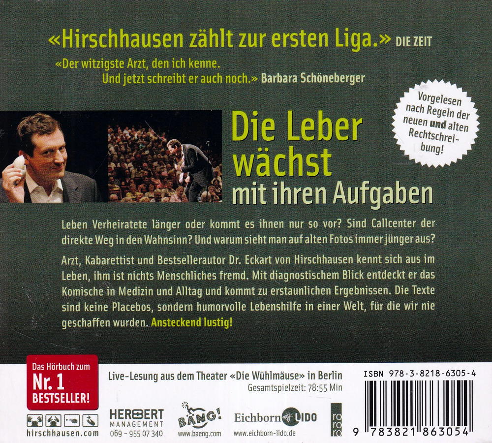 Die Leber wächst mit ihren Aufgaben, sagt Dr. von Hirschhausen und auch sonst erweist sich der alerte Mediziner als begnadeter Diagnostiker vor dem Herrn: keine vermeintlich neue Entdeckung der medizinischen Forschung, kein therapeutischer Unsinn, kein Auswuchs der Medizinbürokratie ist vor seinem beißenden Spott sicher, der intelligenten Witz mit nachhaltigen Botschaften vereint. Denn statt Placebos liefert von Hirschhausen handfeste Lebenshilfe für eine Welt, für die wir eigentlich nicht geschaffen sind.