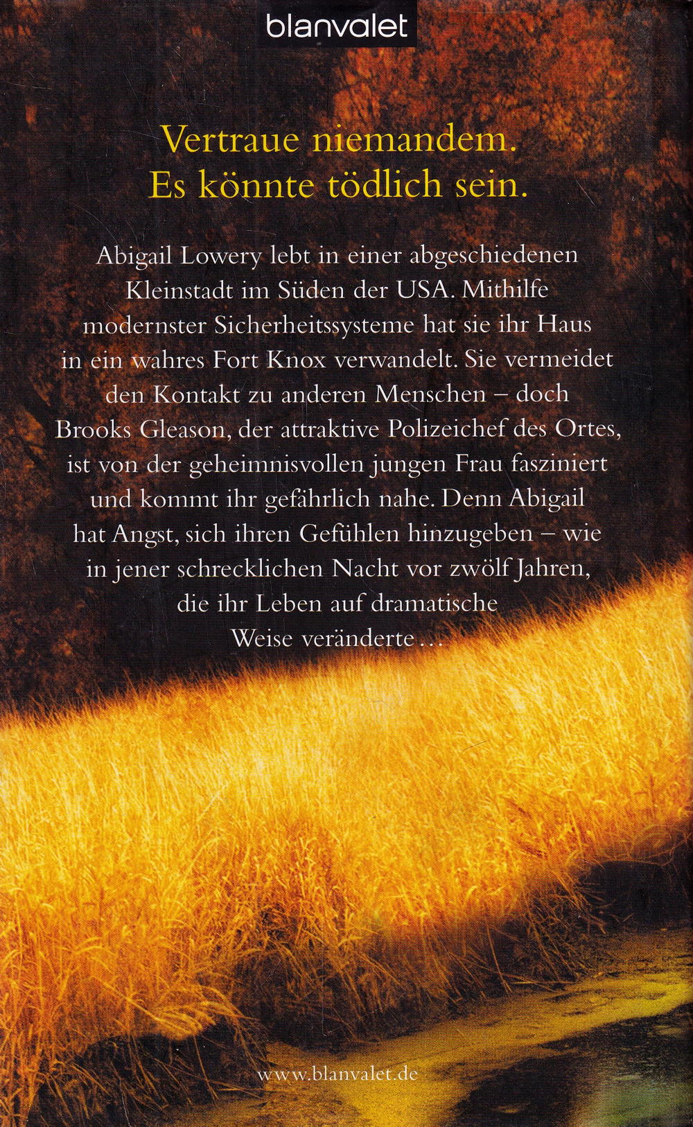 Abigail Lowery lebt in einer abgeschiedenen Kleinstadt im Süden der USA. Mithilfe modernster Sicherheitssysteme hat sie ihr Haus in ein wahres Fort Knox verwandelt. Sie vermeidet den Kontakt zu anderen Menschen - doch Brooks Gleason, der attraktive Polizeichef des Ortes, ist von der geheimnisvollen jungen Frau fasziniert und kommt ihr gefährlich nahe. Denn Abigail hat Angst, sich ihren Gefühlen hinzugeben - wie in jener schrecklichen Nacht vor zwölf Jahren, die ihr Leben auf dramatische Weise veränderte ...