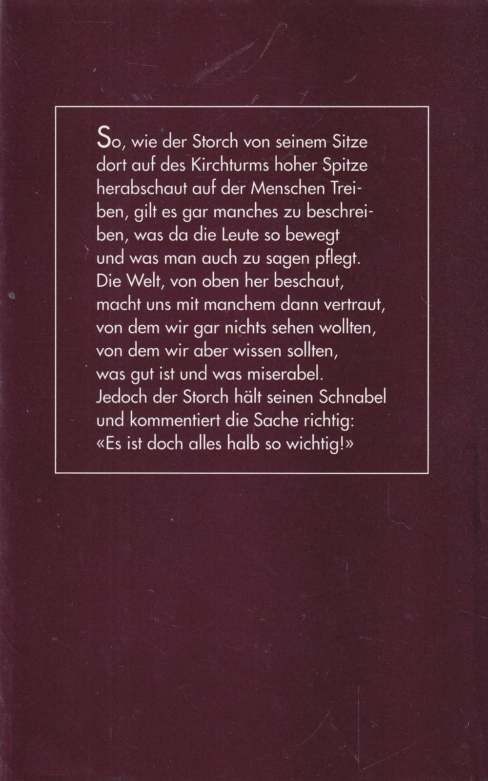 So, wie der Storch von seinem Sitze dort auf des Kirchturms hoher Spitze herabschaut auf der Menschen Treiben, gilt es gar manches zu beschreiben, was da die Leute so bewegt und was man auch zu sagen pflegt.