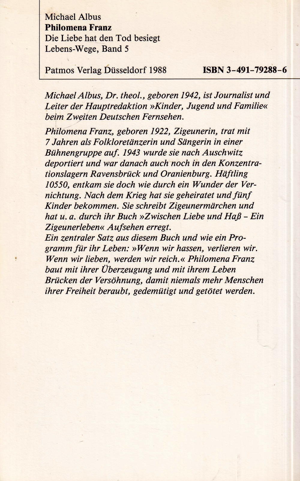 Philomena Franz, geboren 1922, Zigeunerin, trat mit 7 Jahren als Folkloretänzerin und Sängerin in einer Bühnengruppe auf. 1943 wurde sie nach Auschwitz deportiert und war danach auch noch in den Konzentrationslagern Ravensbrück und Oranienburg. Häftling 10550, entkam sie doch wie durch ein Wunder der Vernichtung. Nach dem Krieg hat sie geheiratet und fünf Kinder bekommen. Sie schreibt Zigeunermärchen und hat u. A. Durch ihr Buch »Zwischen Liebe und Hass - Ein Zigeunerleben« Aufsehen erregt.