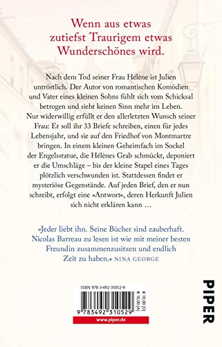 Nach dem Tod seiner Frau Hélène ist Julien untröstlich. Der Autor von romantischen Komödien und Vater eines kleinen Sohns fühlt sich vom Schicksal betrogen und sieht keinen Sinn mehr im Leben. Nur widerwillig erfüllt er den allerletzten Wunsch seiner Frau: Er soll ihr 33 Briefe schreiben, einen für jedes Lebensjahr, und sie auf den Friedhof von Montmartre bringen. In einem kleinen Geheimfach im Sockel der Engelsstatue, die Hélènes Grab schmückt, deponiert er die Umschläge - bis der kleine Stapel eines Tages plötzlich verschwunden ist. Stattdessen findet er mysteriöse Gegenstände. Auf jeden Brief, den er nun schreibt, erfolgt eine "Antwort". Hoffnung und Liebe kehren zurück in das Leben dieses unglücklichen Mannes und seines Sohnes.
