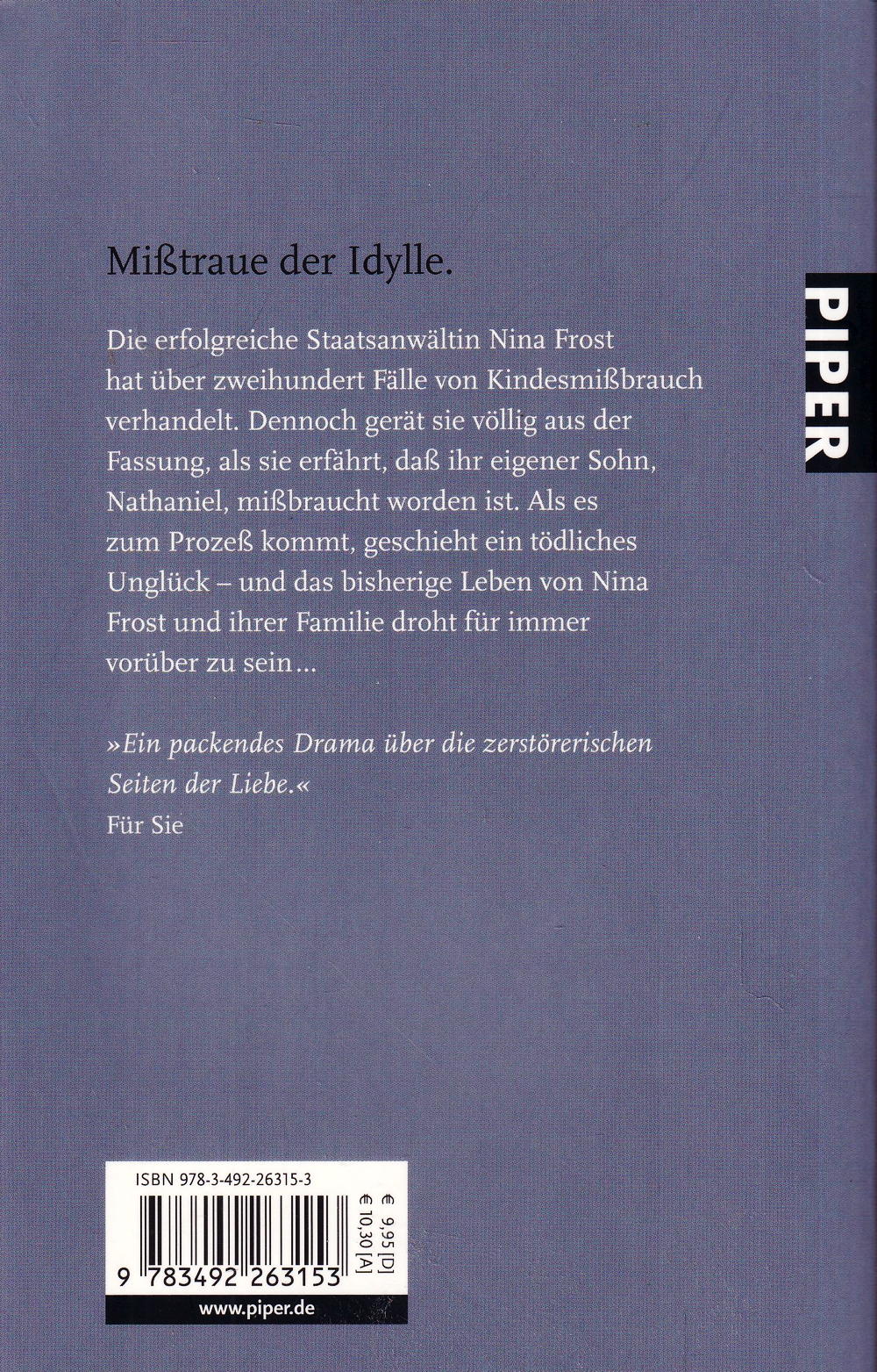 Die erfolgreiche Staatsanwältin Nina Frost hat über 200 Fälle von Kindesmissbrauch verhandelt. Dennoch gerät sie völlig aus der Fassung, als sie erfährt, dass ihr eigener Sohn, Nathaniel, missbraucht worden ist. Als es zum Prozess kommt, geschieht ein tödliches Unglück – und das bisherige Leben von Nina Frost und ihrer Familie droht für immer vorüber zu sein …