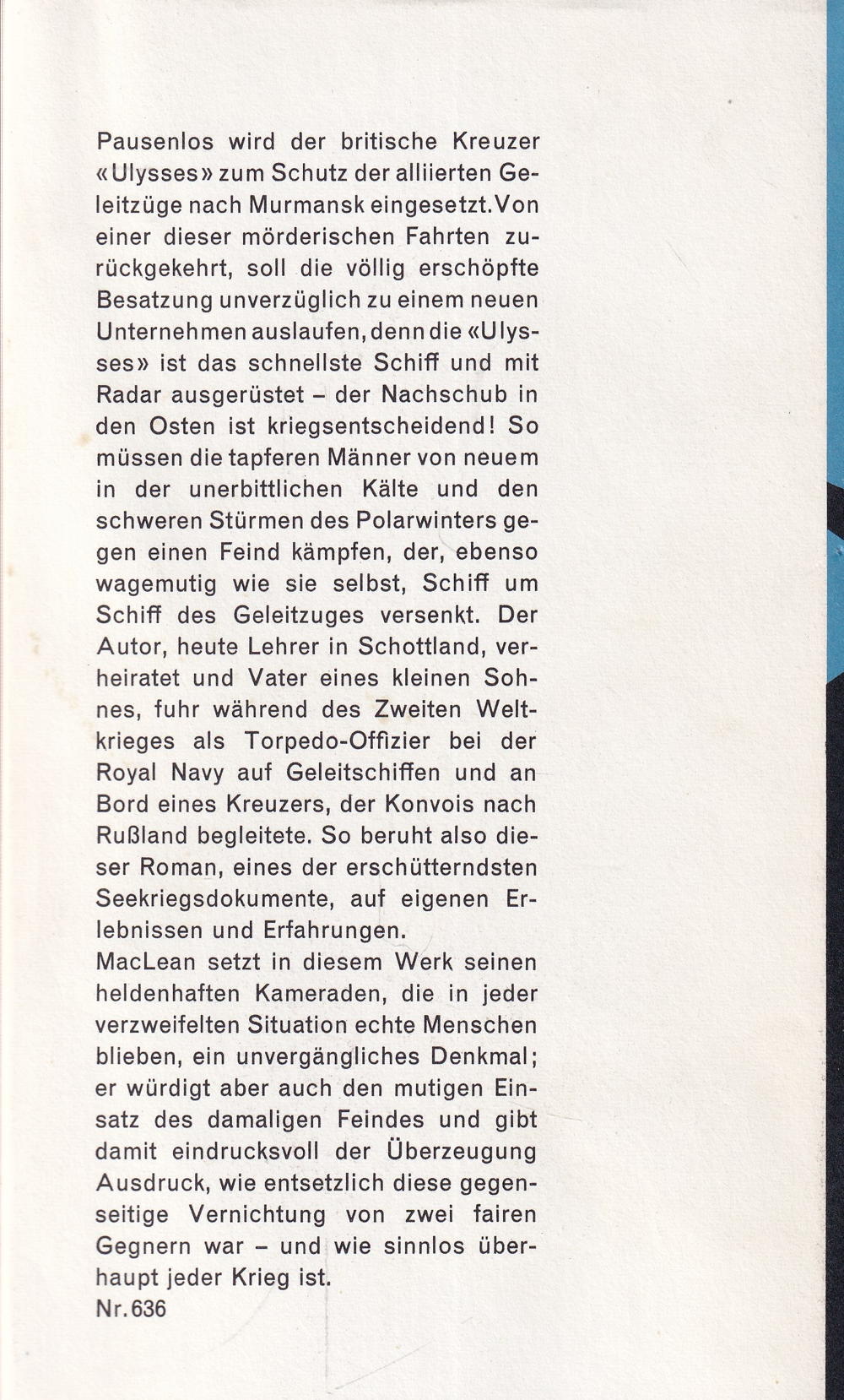 Pausenlos wird der britische Kreuzer « Ulysses» zum Schutz der alliierten Geleitzüge nach Murmansk eingesetzt. Von einer dieser mörderischen Fahrten zurückgekehrt, soll die völlig erschöpfte Besatzung unverzüglich zu einem neuen Unternehmen auslaufen, denn die «Ulysses» ist das schnellste Schiff und mit Radar ausgerüstet - der Nachschub in den Osten ist kriegsentscheidend! So müssen die tapferen Männer von neuem in der unerbittlichen Kälte und den schweren Stürmen des Polarwinters gegen einen Feind kämpfen, der, ebenso wagemutig wie sie selbst, Schiff um Schiff des Geleitzuges versenkt. Der Autor, heute Lehrer in Schottland, verheiratet und Vater eines kleinen Sohnes, fuhr während des Zweiten Weltkrieges als Torpedo-Offizier bei der Royal Navy auf Geleitschiffen und an Bord eines Kreuzers, der Konvois nach Russland begleitete. So beruht also dieser Roman, eines der erschütterndsten Seekriegsdokumente, auf eigenen Erlebnissen und Erfahrungen.