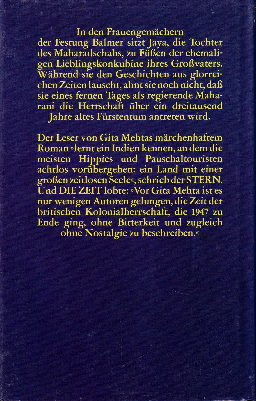 Und DIE ZEIT lobte: »Vor Gita Mehta ist es nur wenigen Autoren gelungen, die Zeit der britischen Kolonialherrschaft, die 1947 zu Ende ging, ohne Bitterkeit und zugleich ohne Nostalgie zu beschreiben. «