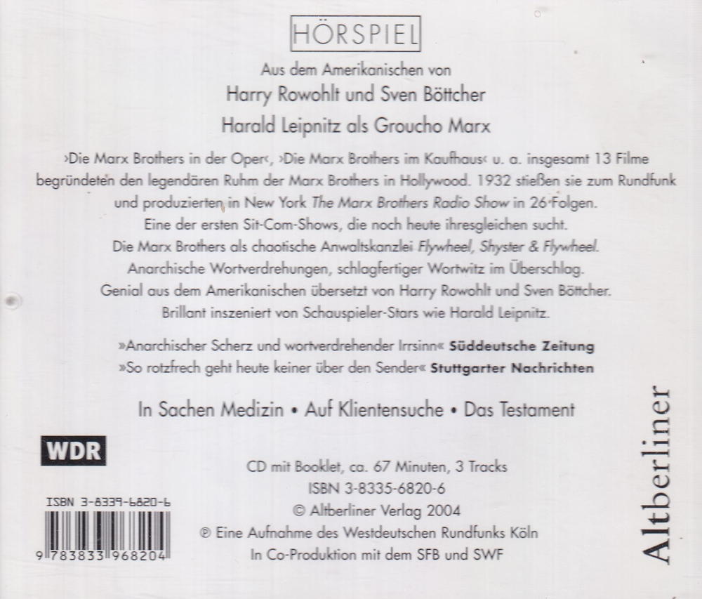 Die Marx Brothers in der Opers, »Die Marx Brothers im Kaufhauss u. A. Insgesamt 13 Filme begründeten den legendāren Ruhm der Marx Brothers in Hollywood. 1932 stiessen sie zum Rundfunk und produzierten, in New York The Marx Brothers Radio Show in 26-Folgen. Eine der ersten Sit-Com-Shows, die noch heute ihresgleichen sucht. Die Marx Brothers als chaotische Anwaltskanzlei Flywheel, Shyster & Flywheel. Anarchische Wortverdrehungen, schlagfertiger Wortwitz im Überschlag. Genial aus dem Amerikanischen übersetzt von Harry Rowohlt und Sven Böttcher. Brillant inszeniert von Schauspieler-Stars wie Harald Leipnitz.