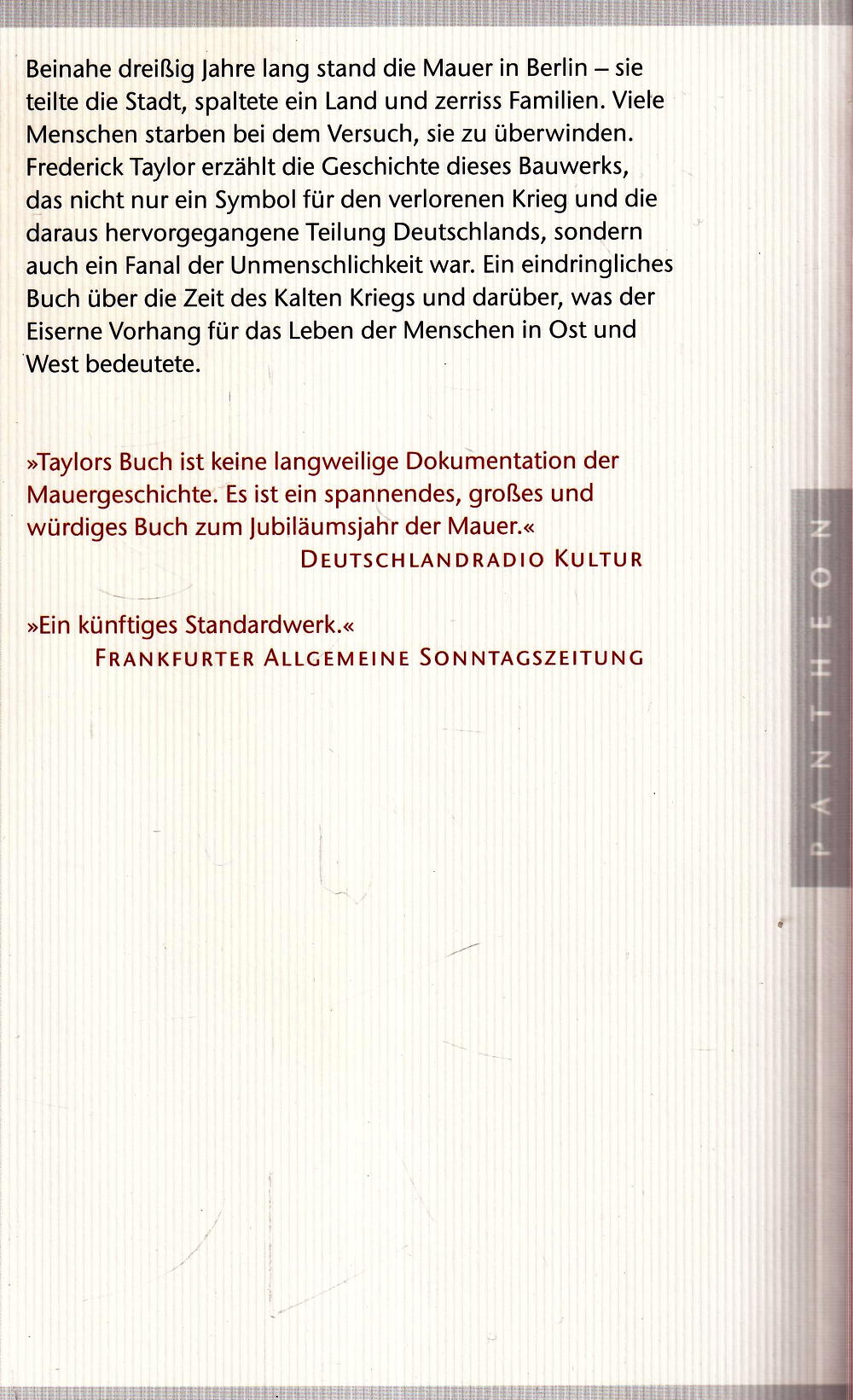 Frederick Taylor erzählt nun erstmals die vollständige Geschichte dieses unmenschlichen Bauwerks und lässt damit zugleich die deutsch-deutsche Nachkriegsgeschichte lebendig werden. Er rekonstruiert die Entscheidungen, die zum Mauerbau führten, beschreibt die Verzweiflung der plötzlich getrennten Familien ebenso wie die dramatischen Fluchtgeschichten, zu denen es an der Mauer immer wieder kam. Gestützt auf intensive Archivrecherchen und Augenzeugenberichte entwirft Taylor ein Panorama Berlins zur Zeit des Ost-West-Konflikts, als beide Teile Deutschlands auch immer ein Spielball im Kampf der Supermächte waren.