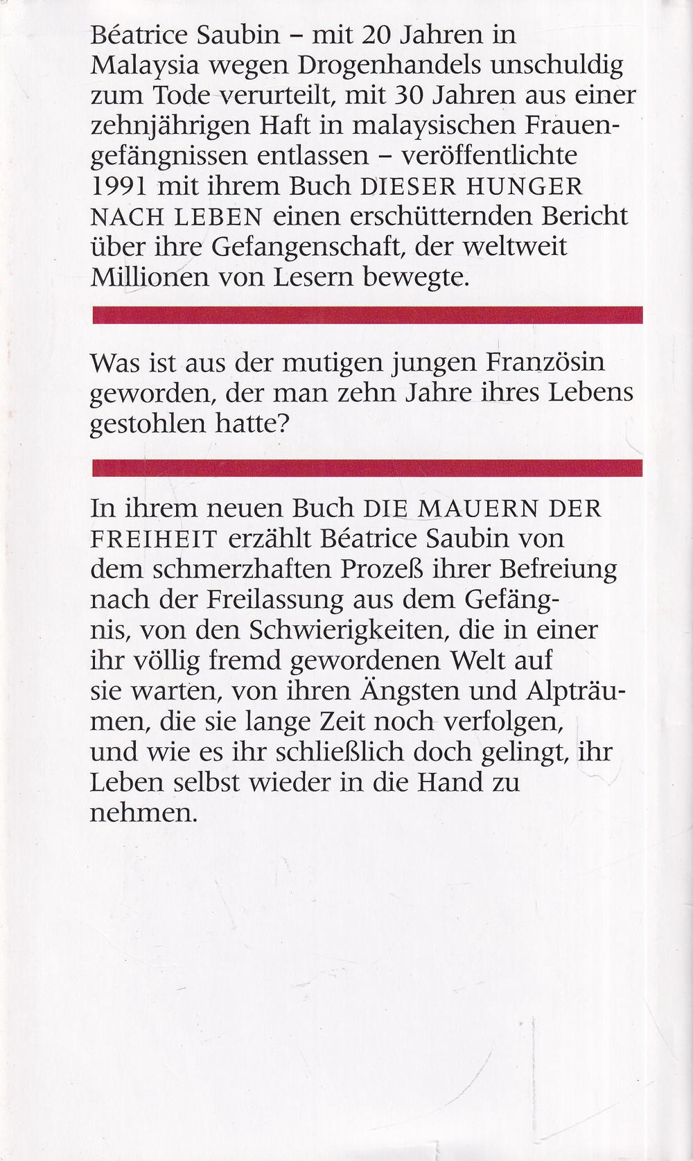 Béatrice Saubin - mit 20 Jahren in Malaysia wegen Drogenhandels unschuldig zum Tode verurteilt, mit 30 Jahren aus einer zehnjährigen Haft in malaysischen Frauengefängnissen entlassen - veröffentlichte 1991 mit ihrem Buch DIESER HUNGER NACH LEBEN einen erschütternden Bericht über ihre Gefangenschaft, der weltweit Millionen von Lesern bewegte.