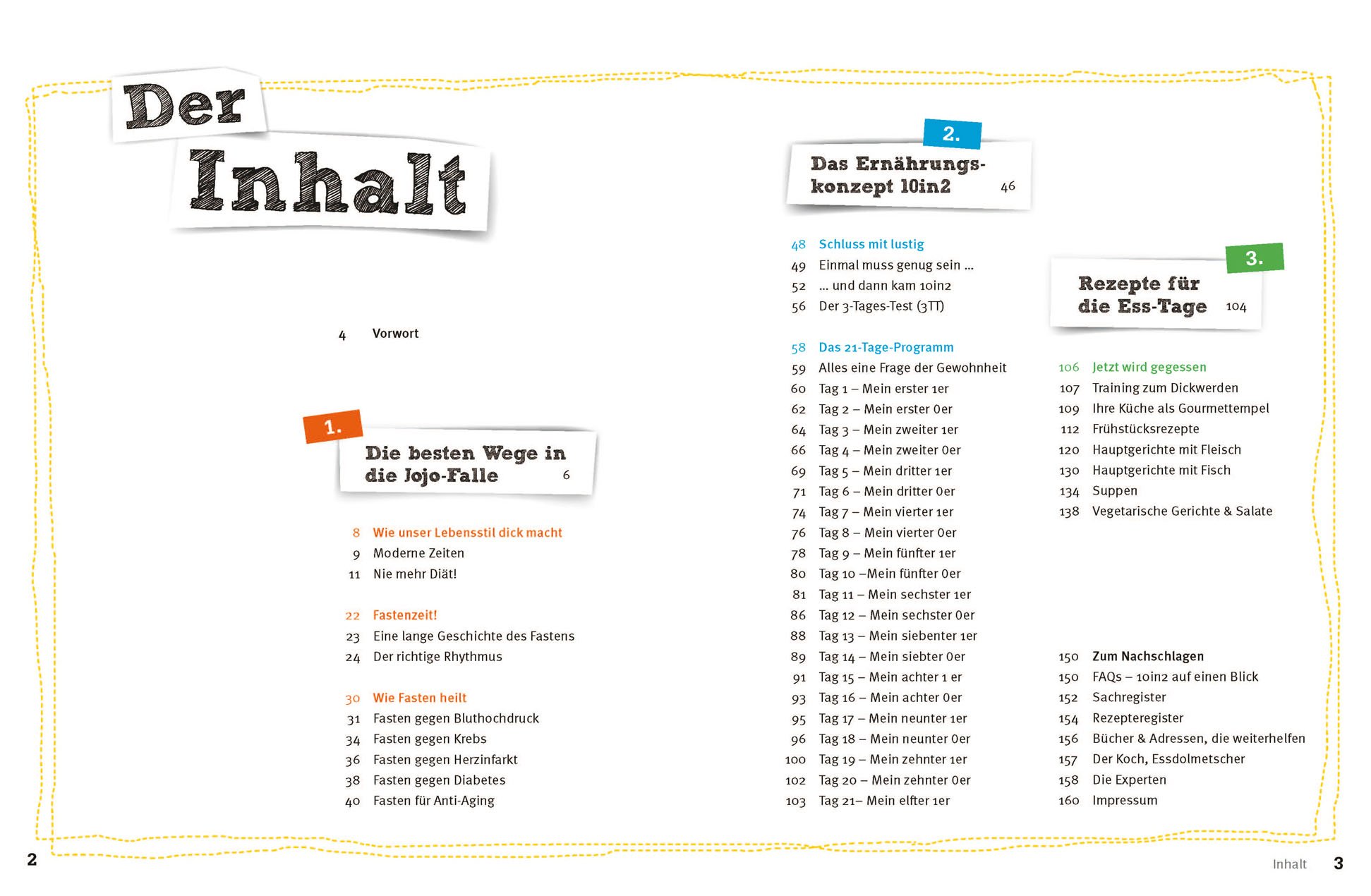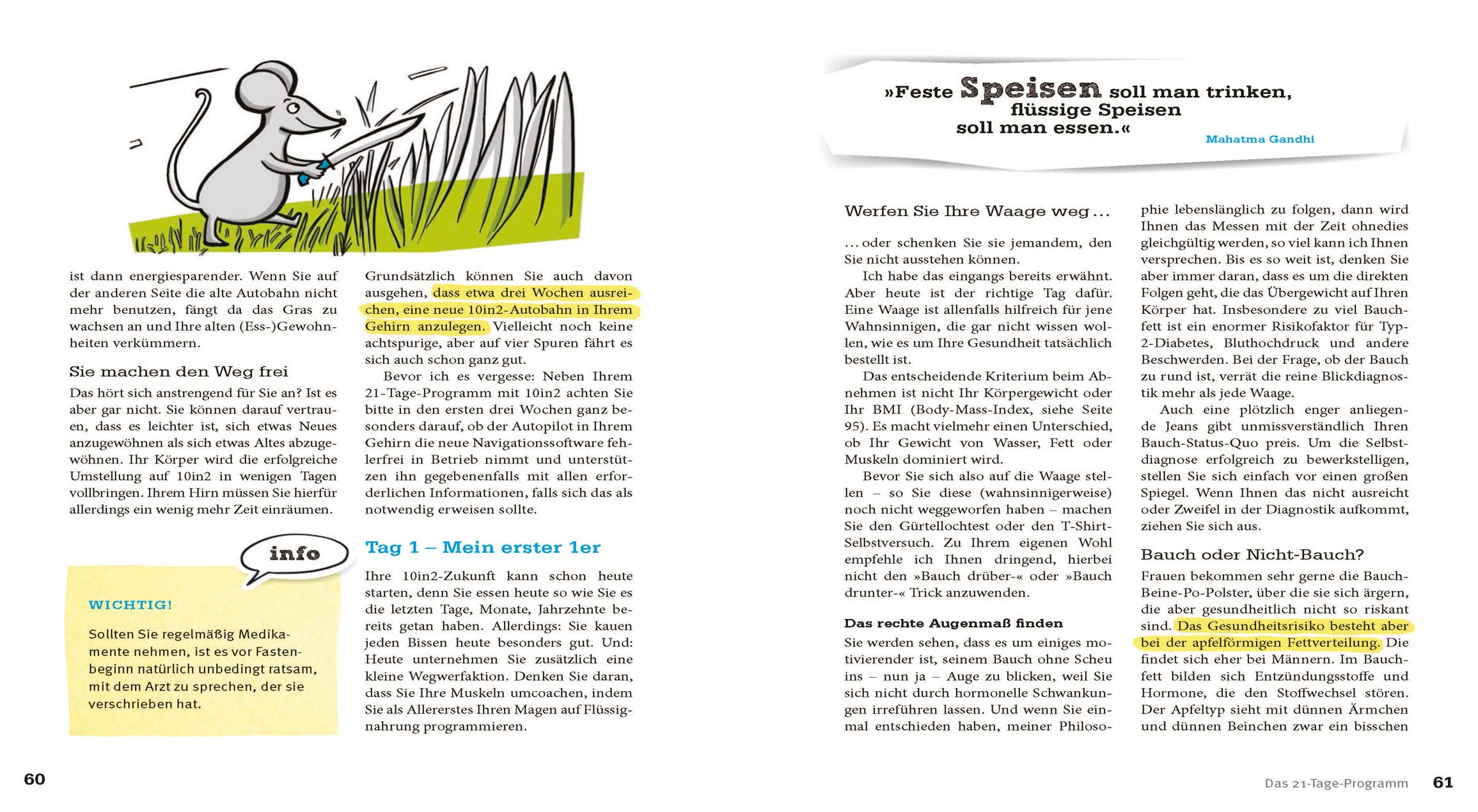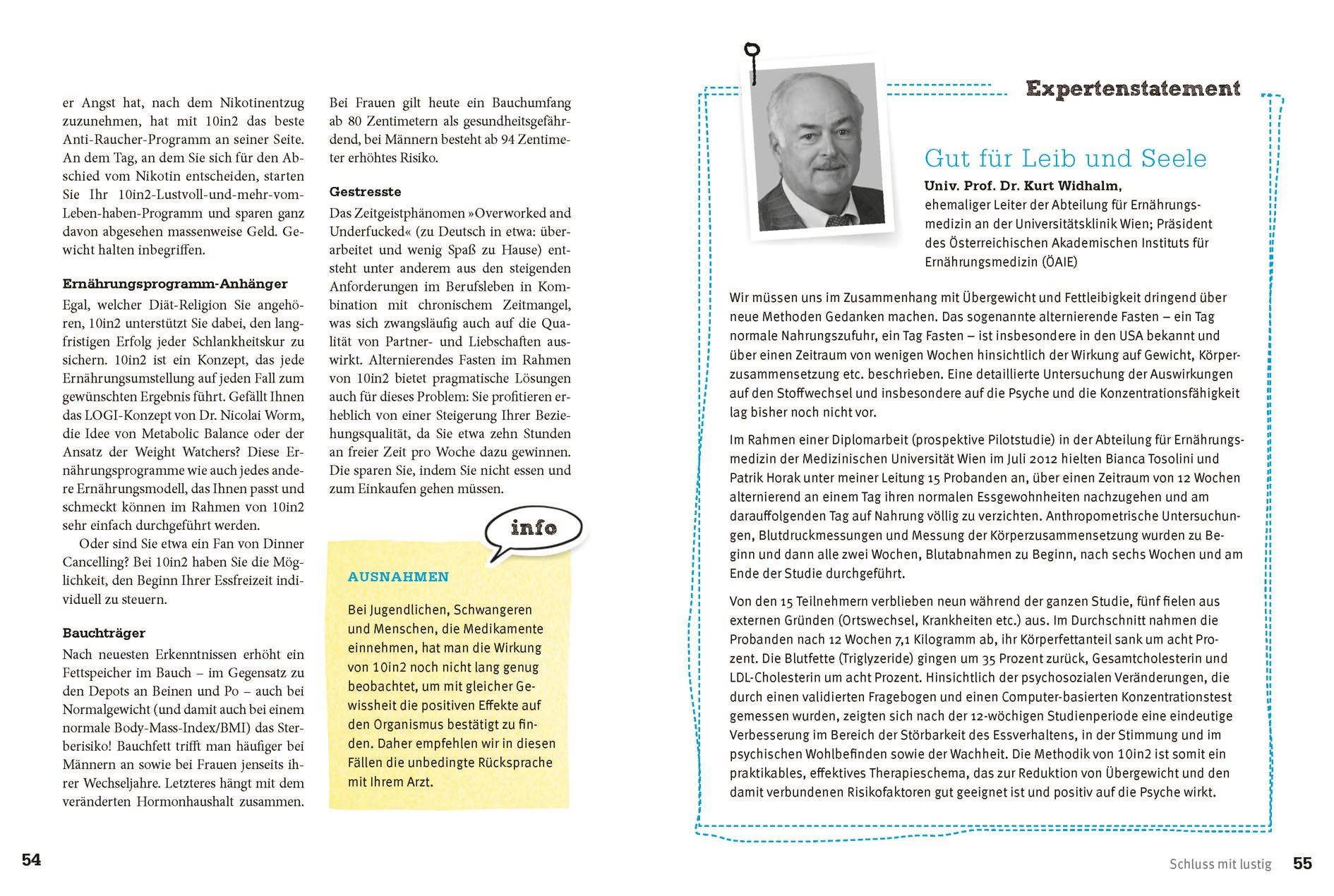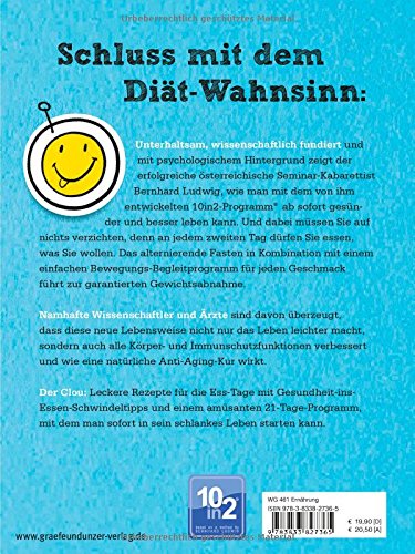 Mit dem Frühstück am nächsten Tag wird das Fasten gebrochen, der Körper verlangt dann automatisch nach gesunden Lebensmitteln. Die Psyche gerät nicht in die Schuldfalle, da es keine Regeln gibt, die man verletzten könnte. Das Buch bietet eine Begleitung über die ersten 21 Tage nach der 10in2-Methode. So lange benötigt der Körper bis er die neue Ernährungsweise adaptiert hat. Zusätzlich werden schrittweise gesunde Ernährung und ein alltagstaugliches Bewegungsprogramm 'hineingeschwindelt'. Dies macht die Lebensstil-Veränderungen besonders nachhaltig. Köstliche Rezepte von Erwin Haas erleichtern dabei die Umstellung.