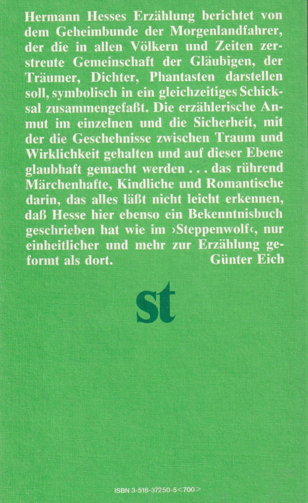 Hesses Erzählung berichtet von dem Geheimbunde der Morgenlandfahrer, der die in allen Völkern und Zeiten zerstreute Gemeinschaft der Gläubigen, der Träumer, Dichter, Phantasten darstellen soll, symbolisch in ein gleichzeitiges Schicksal zusammenfasst. Günter Eich