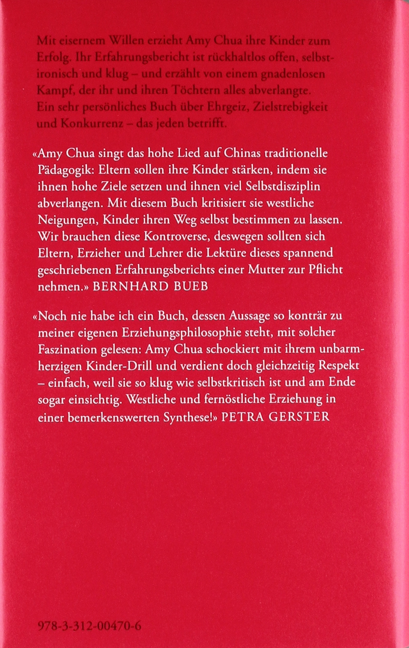 Amy Chua ist Juraprofessorin in Yale und zweifache Mutter. Ihre Kinder will sie zum Erfolg erziehen - mit allen Mitteln. Und gemäss den Regeln ihrer Wurzeln in China ist Erfolg nur mit härtester Arbeit zu erreichen. Sie beschliesst, dass ihre Töchter als Musikerinnen Karriere machen sollen. Nun wird deren Kindheit zur Tortur. Wo eine Eins minus als schlechte Note gilt, muss Lernen anders vermittelt werden als in unserer westlichen Pädagogik. In ihrem Erlebnisbericht erzählt die Autorin fesselnd, witzig und mit kluger Offenheit von einem gnadenlosen Kampf, der ihr und ihren Töchtern alles abverlangte: ein packendes und hochkomisches Buch über Familie und Erziehung, über Leistungsdruck und über den Willen, unbedingt zu siegen.