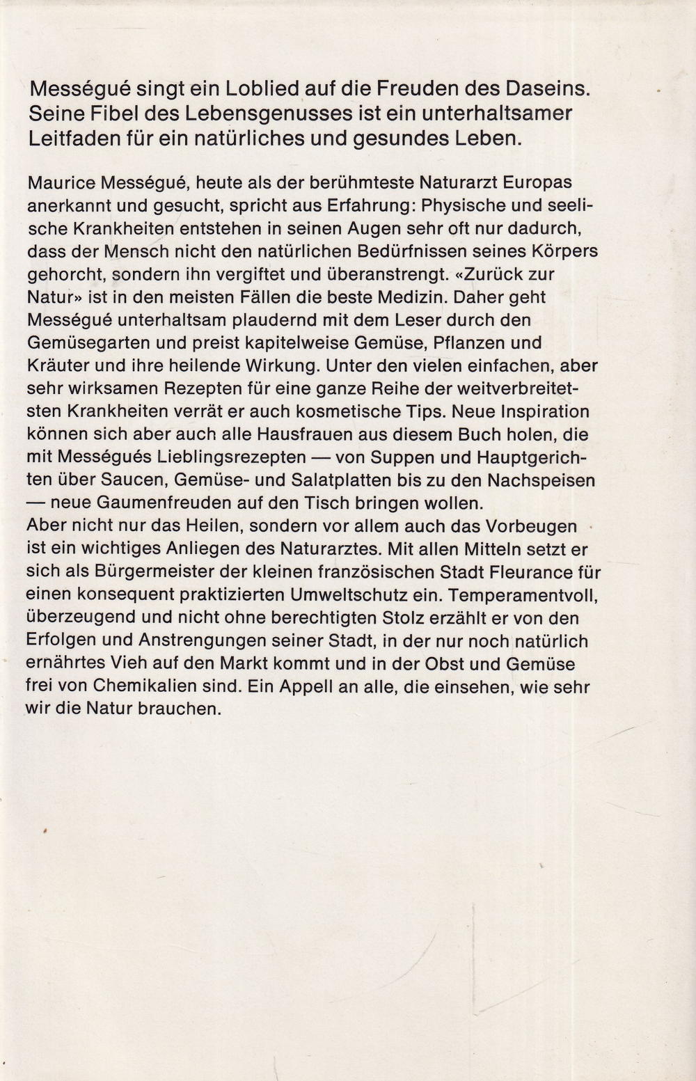 Maurice Mességué, heute als der berühmteste Naturarzt Europas anerkannt und gesucht, spricht aus Erfahrung: Physische und seelische Krankheiten entstehen in seinen Augen sehr oft nur dadurch, dass der Mensch nicht den natürlichen Bedürfnissen seines Körpers gehorcht, sondern ihn vergiftet und überanstrengt. «Zurück zur Natur» ist in den meisten Fällen die beste Medizin. Daher geht Mességué unterhaltsam plaudernd mit dem Leser durch den Gemüsegarten und preist kapitelweise Gemüse, Pflanzen und Kräuter und ihre heilende Wirkung. Unter den vielen einfachen, aber sehr wirksamen Rezepten für eine ganze Reihe der weitverbreitetsten Krankheiten verrät er auch kosmetische Tips. Neue Inspiration können sich aber auch alle Hausfrauen aus diesem Buch holen, die mit Mességués Lieblingsrezepten- von Suppen und Hauptgerichten über Saucen, Gemüse- und Salatplatten bis zu den Nachspeisen neue Gaumenfreuden auf den Tisch bringen wollen.