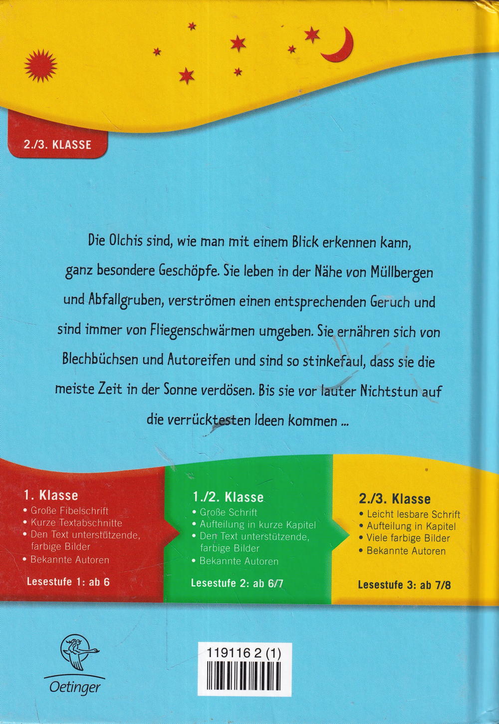 Muffelfurzcooler Lesespass mit den Olchis. Die Olchis sind, wie man mit einem Blick erkennen kann, ganz besonders liebreizende Geschöpfe. Sie leben in der Nähe von Müllbergen und Abfallgruben, verströmen einen entsprechenden Geruch und sind immer von Fliegenschwärmen umgeben. Sie ernähren sich von Blechbüchsen, Autoreifen und Haarschampoo und sind so stinkefaul, dass sie die meiste Zeit in der Sonne verdösen. Bis sie vor lauter Nichtstun auf die verrücktesten Ideen kommen... Die Lesestarter von Oetinger motivieren auch leseschwache Kinder zum Lesen. Wie? Mit bekannten Autoren, starken Charakteren und populären Themen, die Kinder im Alter von fünf bis zehn Jahren begeistern. Und mit vielen Bildern, Spielen und Leserätseln. So einfach ist Lesenlernen mit den Olchis: Liebenswerte Figuren, einfache Texte, und beliebte Themen motivieren und machen Spass.