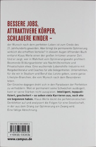 Immer mehr Menschen streben das perfekte Leben an, für sich und bereits für die eigenen Kinder – ob es um Fitness, Schönheit, Jugendlichkeit, schulische oder berufl iche Erfolge geht. In seinem Augen öff nenden Buch zeigt Klaus Werle, wer davon wirklich profi tiert: eine Industrie aus privaten Bildungsanbietern wie Nachhilfeinstituten, Privatschulen und Karriere-Coaches. Die Unternehmen, für die wir in Schule, Studium und Beruf das Letzte geben und denen wir als aktive Kunden freudig teure Serviceleistungen abnehmen. Und nicht zuletzt der Staat, der weniger für Gesundheit und Renten ausgeben muss, sowie ganze Branchen, die vom Wunsch nach dem Besonderen und ethisch Guten leben. Doch der Perfektionswahn hat bislang unbekannte prekäre Folgen für den Einzelnen, die Wirtschaft und die Gesellschaft. Klaus Werle deckt sie auf und entlarvt die perfektionistischen Denkfehler. Eine fällige Abrechnung.