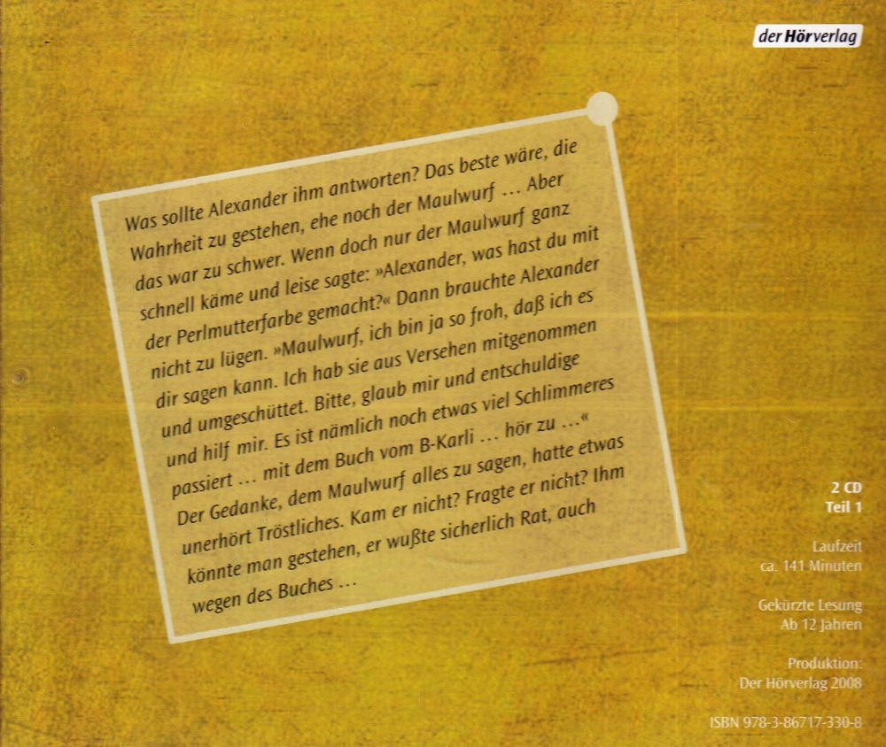 Was sollte Alexander ihm antworten? Das beste wäre, die Wahrheit zu gestehen, ehe noch der Maulwurf... Aber das war zu schwer. Wenn doch nur der Maulwurf ganz schnell käme und leise sagte: »Alexander, was hast du mit der Perlmutterfarbe gemacht? « Dann brauchte Alexander nicht zu lügen. »Maulwurf, ich bin ja so froh, dass ich es dir sagen kann. Ich hab sie aus Versehen mitgenommen und umgeschüttet. Bitte, glaub mir und entschuldige und hilf mir. Es ist nämlich noch etwas viel Schlimmeres passiert... Mit dem Buch vom B-Karli... Hör zu... «