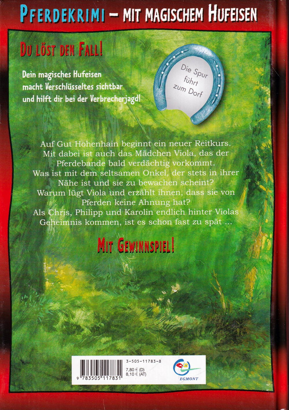 Du löst den Fall! Dein magisches Hufeisen macht Verschlüsseltes sichtbar und hilft dir bei der Verbrecherjagd! Auf Gut Hohenhain beginnt ein neuer Reitkurs. Mit dabei ist auch das Mädchen Viola, das der Pferdebande bald verdächtig vorkommt. Was ist mit dem seltsamen Onkel, der stets in ihrer Nähe ist und sie zu bewachen scheint? Warum lügt Viola und erzählt ihnen, dass sie von Pferden keine Ahnung hat? Als Chris, Philipp und Karolin endlich hinter Violas Geheimnis kommen, ist es schon fast zu spät...