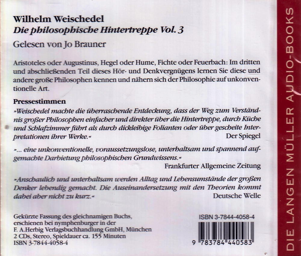 Wilhelm Weischedel, geb. 1905 in Frankfurt a.M., studierte in Marburg evangelische Theologie, Philosophie und Geschichte. 1932 Promotion zum Dr. phil. in Freiburg. Nach 1945 Dozent, dann Professor der Philosophie in Tübingenund in Berlin; 1970 emeritiert. Er starb 1975 in Berlin.