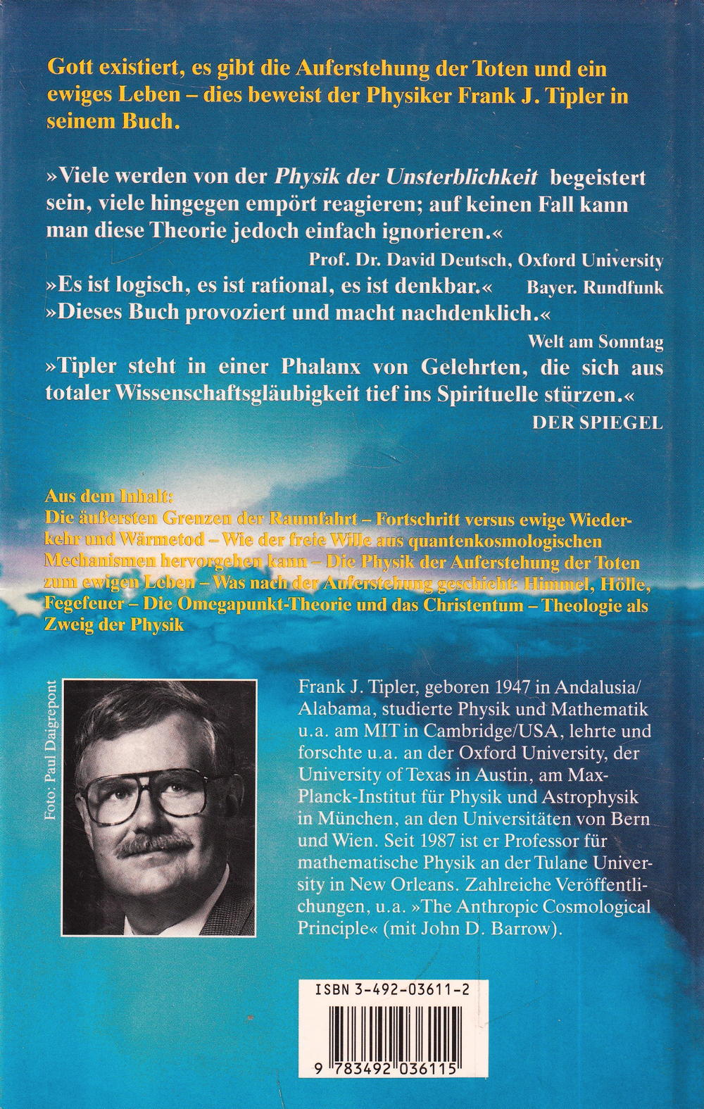 Der amerikanische Physiker Professor F. J. Tipler unternimmt den Versuch, die Existenz Gottes und die Auferstehung nach dem Tode mit den Mitteln der Naturwissenschaft zu beweisen. "Zu Beginn meiner Laufbahn als Physiker hätte ich mir nie träumen lassen, dass ich eines Tages als Physiker schreiben würde, dass es den Himmel gibt und dass jeden, und zwar jeden einzelnen von uns, ein Leben nach dem Tode erwartet. Und doch, hier stehe ich und schreibe Dinge, die mein früheres Ich als wissenschaftlichen Unsinn abgetan hätte..."