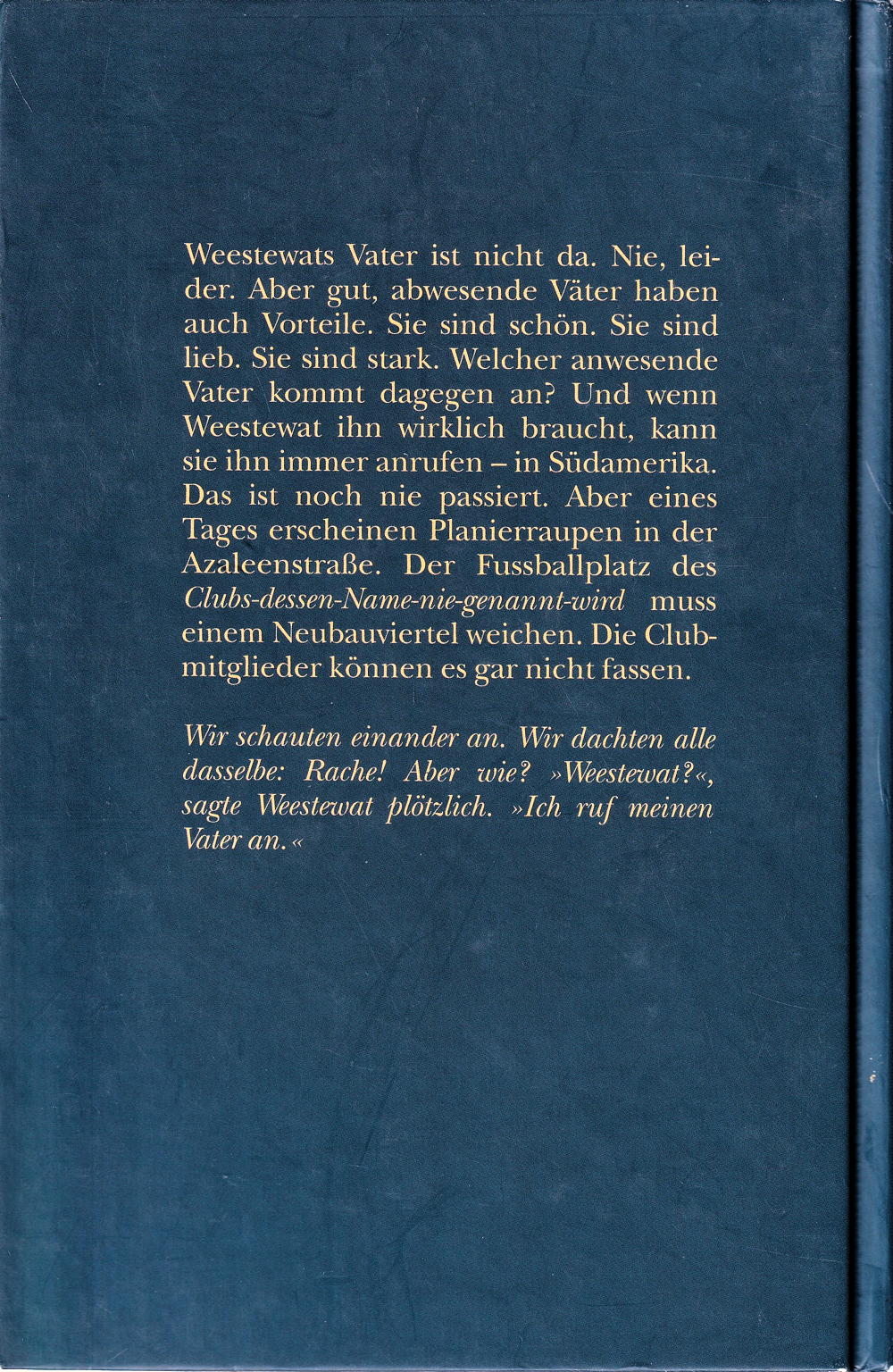 Der Vater der kleinen Weestewat ist nie da. Wo er denn eigentlich sei und was er denn mache, wollen ihre Freunde wissen. »Er ist Marmorzüchter in Venezuela«, behauptet Weestewat. Klar, dass ihr das niemand so recht glauben mag. Erst als der Fussballplatz der Clique einer geplanten Neubausiedlung zum Opfer fällt und Weestewat ihren Vater um Hilfe bitten will, ändert sich das. Denn plötzlich gibt es einen Brand im Rohbau der Siedlung und ein Tornado überschwemmt das ganze Bauland. »Ein Buch wie aus einem Guss mit einem Zauber, den man beim Lesen verspürt.« ESELSOHR