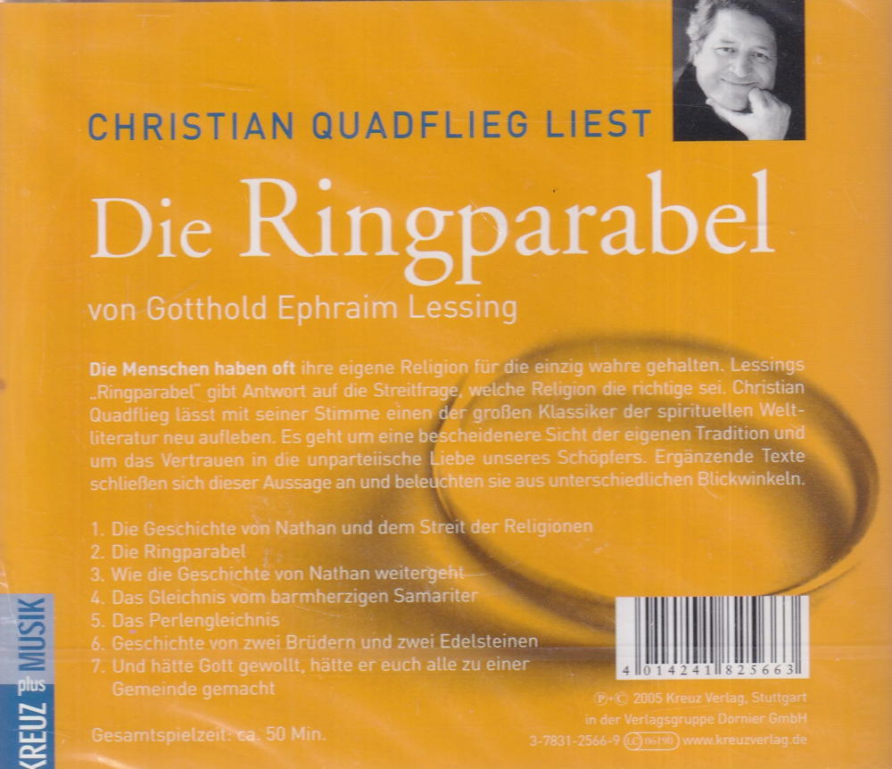 Die Menschen haben oft ihre eigene Religion für die einzig wahre gehalten. Lessings Ringparabel" gibt Antwort auf die Streitfrage, welche Religion die richtige sei. Christian Quadflieg lässt mit seiner Stimme einen der grossen Klassiker der spirituellen Weltliteratur neu aufleben. Es qeht um eine bescheidenere Sicht der eigenen Tradition und um das Vertrauen in die unparteiische Liebe unseres Schöpfers. Ergänzende Texte schliessen sich dieser Aussage an und beleuchten sie aus unterschiedlichen Blickwinkeln.