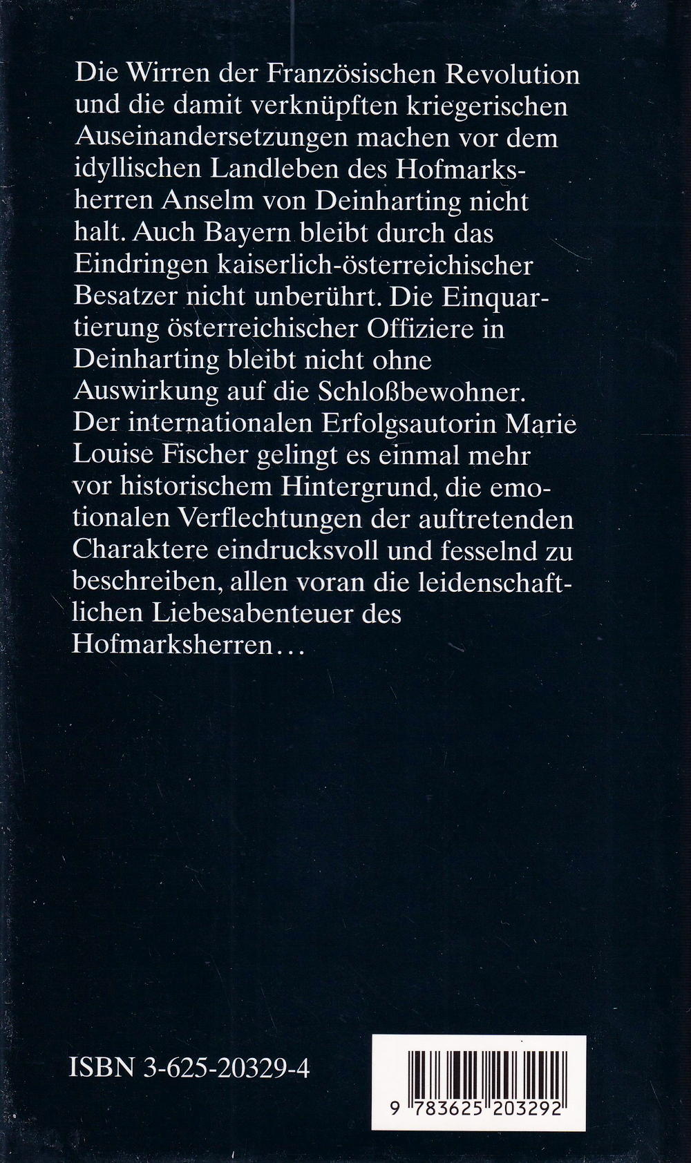 Die Wirren der Französischen Revolution und die damit verknüpften kriegerischen Auseinandersetzungen machen vor dem idyllischen Landleben des Hofmarksherren Anselm von Deinharting nicht halt. Auch Bayern bleibt durch das Eindringen kaiserlich-österreichischer Besatzer nicht unberührt. Die Einquartierung österreichischer Offiziere in Deinharting bleibt nicht ohne Auswirkung auf die Schlossbewohner. Der internationalen Erfolgsautorin Marie Louise Fischer gelingt es einmal mehr vor historischem Hintergrund, die emotionalen Verflechtungen der auftretenden Charaktere eindrucksvoll und fesselnd zu beschreiben, allen voran die leidenschaftlichen Liebesabenteuer des Hofmarksherren...