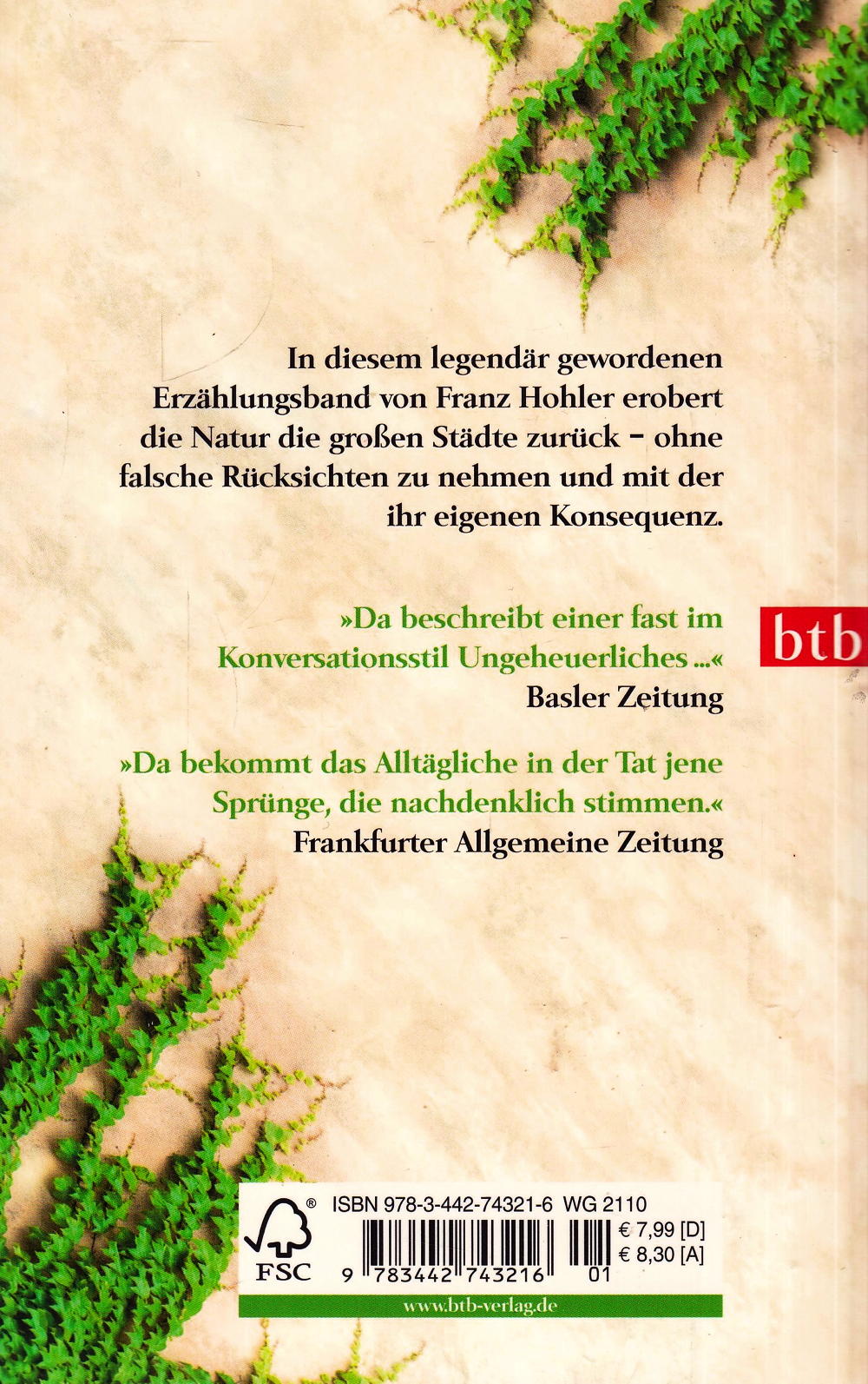 »Eines Tages, als ich an meinem Schreibtisch sass und zum Fenster hinausschaute, sah ich, dass sich auf der Fernsehantenne des gegenüberliegenden Hauses ein Adler niedergelassen hatte. Ich muss dazu sagen, dass ich in Zürich wohne.« Wenig später finden Passanten auf einem belebten Platz ein mächtiges Hirschgeweih. Tage darauf trabt schon ein ganzes Rudel Hirsche durch die Stadt, und jemand ist sich ganz sicher, einen Wolf gesehen zu haben. Die Natur beginnt eine Stadt zurückzugewinnen und macht aus deren Bewohner staunende Zuschauer. Nicht nur in dieser, auch in den anderen acht Erzählungen dieses Bands bekommt die glatte Oberfläche des Alltags tiefe Risse …