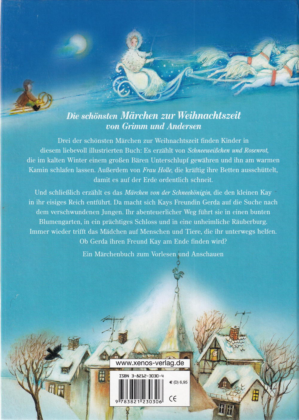 Drei der schönsten Märchen zur Weihnachtszeit finden Kinder in diesem liebevoll illustrierten Buch: Es erzählt von Schneeweisschen und Rosenrot, die im kalten Winter einem grossen Bären Unterschlupf gewähren und ihn am warmen Kamin schlafen lassen. Ausserdem von Frau Holle, die kräftig ihre Betten ausschüttelt, damit es auf der Erde ordentlich schneit. Und schliesslich erzählt es das Märchen von der Schneekönigin, die den kleinen Kay in ihr eisiges Reich entführt. Da macht sich Kays Freundin Gerda auf die Suche nach dem verschwundenen Jungen. Ihr abenteuerlicher Weg führt sie in einen bunten Blumengarten, in ein prächtiges Schloss und in eine unheimliche Räuberburg. Immer wieder trifft das Mädchen auf Menschen und Tiere, die ihr unterwegs helfen. Ob Gerda ihren Freund Kay am Ende finden wird? Ein Märchenbuch zum Vorlesen und Anschauen