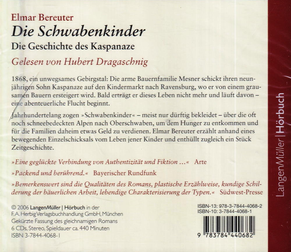 Jahrhundertelang zogen »Schwabenkinder« - meist nur dürftig bekleidet – über die oft noch schneebedeckten Alpen nach Oberschwaben, um'dem Hunger zu entkommen und für die Familien daheim etwas Geld zu verdienen. Elmar Bereuter erzählt anhand eines bewegenden Einzelschicksals vom Leben jener Kinder und enthüllt zugleich ein Stück Zeitgeschichte.