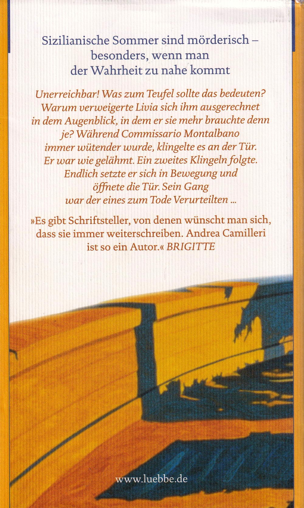 Während Commissario Montalbano immer wütender wurde, klingelte es an der Tür. Er war wie gelähmt. Ein zweites Klingeln folgte. Endlich setzte er sich in Bewegung und öffnete die Tür. Sein Gang war der eines zum Tode Verurteilten...