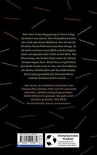 Ein sprachgewaltiger und überraschender Coming-of-Age-Roman für Jugendliche, voller Tiefgang und Gefühl, neu und aufregend. Seit ihrer ersten Begegnung ist Nova völlig fasziniert von Akoua. Ihre Gedanken kreisen nur noch um dieses Mädchen, das mit ihrem Strahlen Novas Welt zum Leuchten bringt. Es ist Liebe auf den ersten Blick und der Beginn einer aufregenden Zeit voller erster Male. Ein Neuanfang, der keinen Platz mehr für bittere Erinnerungen lässt. Denn Nova ist glücklich und denkt kaum noch an das, was ihre Mutter, ihr kleiner Halbbruder und sie erlebt haben. Doch dann geschieht das Unvorstellbare und der Schmerz kehrt zurück …