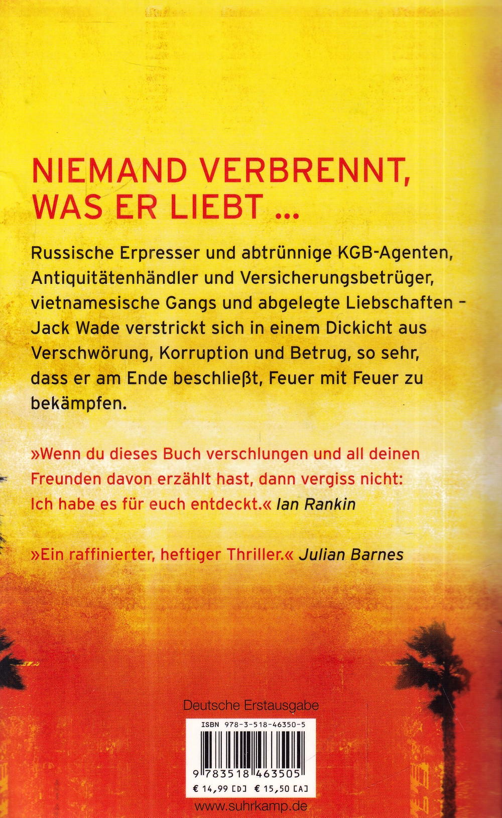 Jack Wade war der Star der Abteilung für Brandstiftung des Orange County Sheriff Departments (Kalifornien), bis ihn eine angebliche Falschaussage die Karriere kostete. Dass sein Kollege Bentley die Finger im Spiel hatte, ist eine andere Geschichte. Für seinen neuen Arbeitgeber, die "California Fire & Life", ermittelt er in einem Versicherungsfall: Das Anwesen des Immobilienmoguls Nicky Vale ist bis auf die Grundmauern abgebrannt - mitsamt seiner jungen Frau Pamela. Auch Bentley war schon am Brandort. Er tippt auf zu viel Wodka und eine brennende Zigarette. Aber Jack Wade kennt die Sprache des Feuers. Und macht sich auf Spurensuche. Bis er herausfindet, dass Nicky Vale mitnichten der unbescholtene amerikanische Bürger ist, als der er sich ausgibt, wird die Sache so heiss, dass Jack Gefahr läuft, sich die Finger zu verbrennen.Russische Erpresser und abtrünnige KBG-Agenten, Antiquitätenhändler und Versicherungsbetrüger, vietnamesische Gangs und abgelegte Liebschaften - Jack Wade verstrickt sich in einem Dickicht aus Verschwörung, Korruption und Betrug, so sehr, dass er am Ende beschliesst, Feuer mit Feuer zu bekämpfen.
