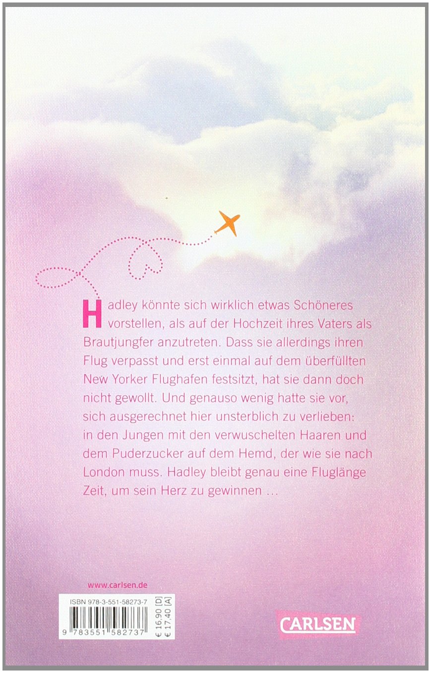 Hadley könnte sich wirklich etwas Schöneres vorstellen, als auf der Hochzeit ihres Vaters Brautjungfer zu spielen. Dass sie dann allerdings ihr Flugzeug verpasst und erst einmal auf dem überfüllten New Yorker Flughafen festsitzt, hat sie dann doch nicht gewollt. Und genauso wenig hatte sie vor, sich ausgerechnet hier unsterblich zu verlieben: in den Jungen mit den verwuschelten Haaren und dem Puderzucker auf dem Hemd, der wie sie nach London muss. Hadley bleibt genau eine Fluglänge Zeit, um sein Herz zu gewinnen ...