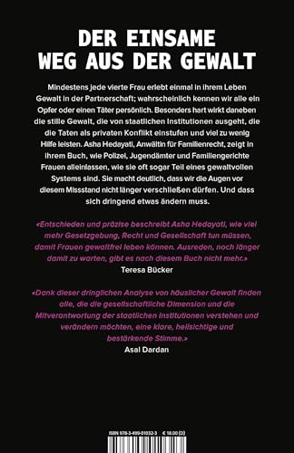 Gewalt gegen Frauen ist eines der drängendsten Probleme unserer Zeit, sie hat sich in den letzten Jahren noch einmal deutlich verschärft. Asha Hedayati, Anwältin für Familienrecht, beschreibt in ihrem Buch, wie der Staat die betroffenen Frauen alleinlässt, und zeigt auf, was sich ändern muss, damit die zuständigen Institutionen wirklich den Schutz bieten, den sie leisten sollten. Die Autorin macht immer wieder die Erfahrung, dass die staatlichen Strukturen Frauen nicht nur unzureichend vor Gewalt schützen, sondern sogar selbst Teil eines gewaltvollen Systems sind. Partnerschaftsgewalt ist wie ein blinder Fleck bei Familiengerichten, Polizei und Jugendämtern, in Sorge- und Umgangsrechtsverfahren. Dabei ist jede vierte Frau ist einmal in ihrem Leben von Gewalt in ihrer Partnerschaft betroffen; mit grosser Sicherheit haben wir alle im Bekannten- und Freundeskreis sowohl Betroffene als auch Täter. «Entschieden und präzise beschreibt Asha Hedayati, wie viel mehr Gesetzgebung, Recht und Gesellschaft tun müssen, damit Frauen gewaltfrei leben können. Ausreden, noch länger damit zu warten, gibt es nach diesem Buch nicht mehr. » Teresa Bücker