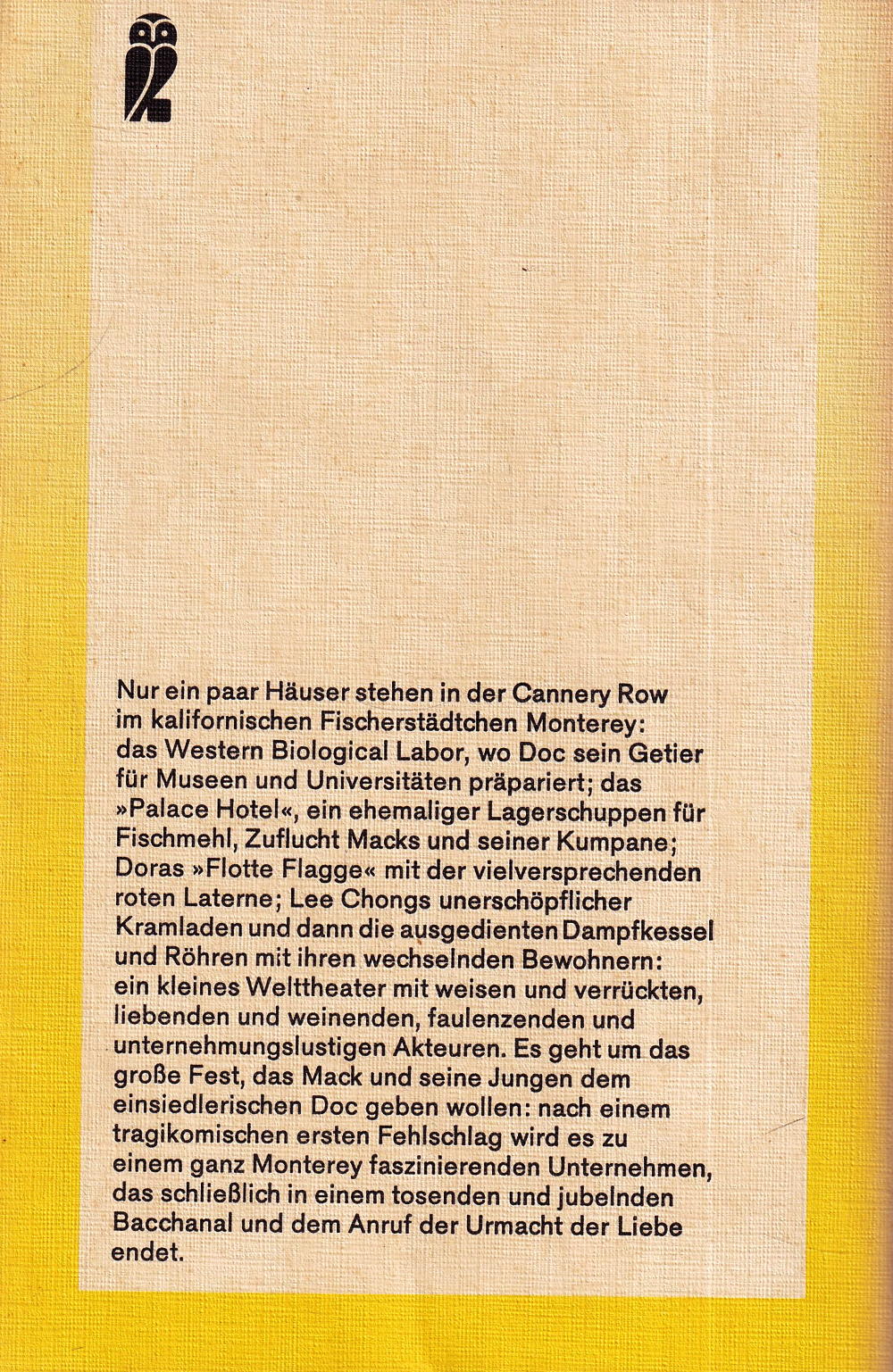 Nur ein paar Häuser stehen in der Cannery Row im kalifornischen Fischerstädtchen Monterey: das Western Biological Labor, wo Doc sein Getier für Museen und Universitäten präpariert; das »Palace Hotel«, ein ehemaliger Lagerschuppen für Fischmehl, Zuflucht Macks und seiner Kumpane; Doras »Flotte Flagge« mit der vielversprechenden roten Laterne; Lee Chongs unerschöpflicher Kramladen und dann die ausgedienten Dampfkessel und Röhren mit ihren wechselnden Bewohnern: ein kleines Welttheater mit weisen und verrückten, liebenden und weinenden, faulenzenden und unternehmungslustigen Akteuren. Es geht um das grosse Fest, das Mack und seine Jungen dem einsiedlerischen Doc geben wollen: nach einem tragikomischen ersten Fehlschlag wird es zu einem ganz Monterey faszinierenden Unternehmen, das schliesslich in einem tosenden und jubelnden Bacchanal und dem Anruf der Urmacht der Liebe endet.