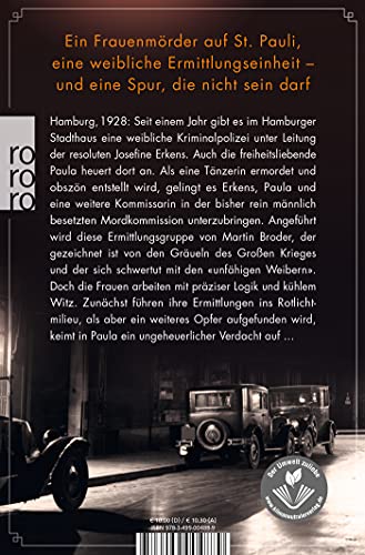 Hamburg, 1928: Seit einem Jahr gibt es im Hamburger Stadthaus eine weibliche Kriminalpolizei unter Leitung der resoluten Josefine Erkens. Auch die freiheitsliebende Paula heuert dort an. Als eine Tänzerin ermordet und obszön entstellt wird, gelingt es Erkens, Paula und eine weitere Kommissarin in der bisher rein männlich besetzten Mordkommission unterzubringen. Angeführt wird diese Ermittlungsgruppe von Martin Broder, der gezeichnet ist von den Gräueln des Grossen Krieges und der sich schwertut mit den «unfähigen Weibern». Doch die Frauen arbeiten mit präziser Logik und kühlem Witz. Zunächst führen ihre Ermittlungen ins Rotlichtmilieu, als aber ein weiteres Opfer aufgefunden wird, keimt in Paula ein ungeheuerlicher Verdacht auf...
