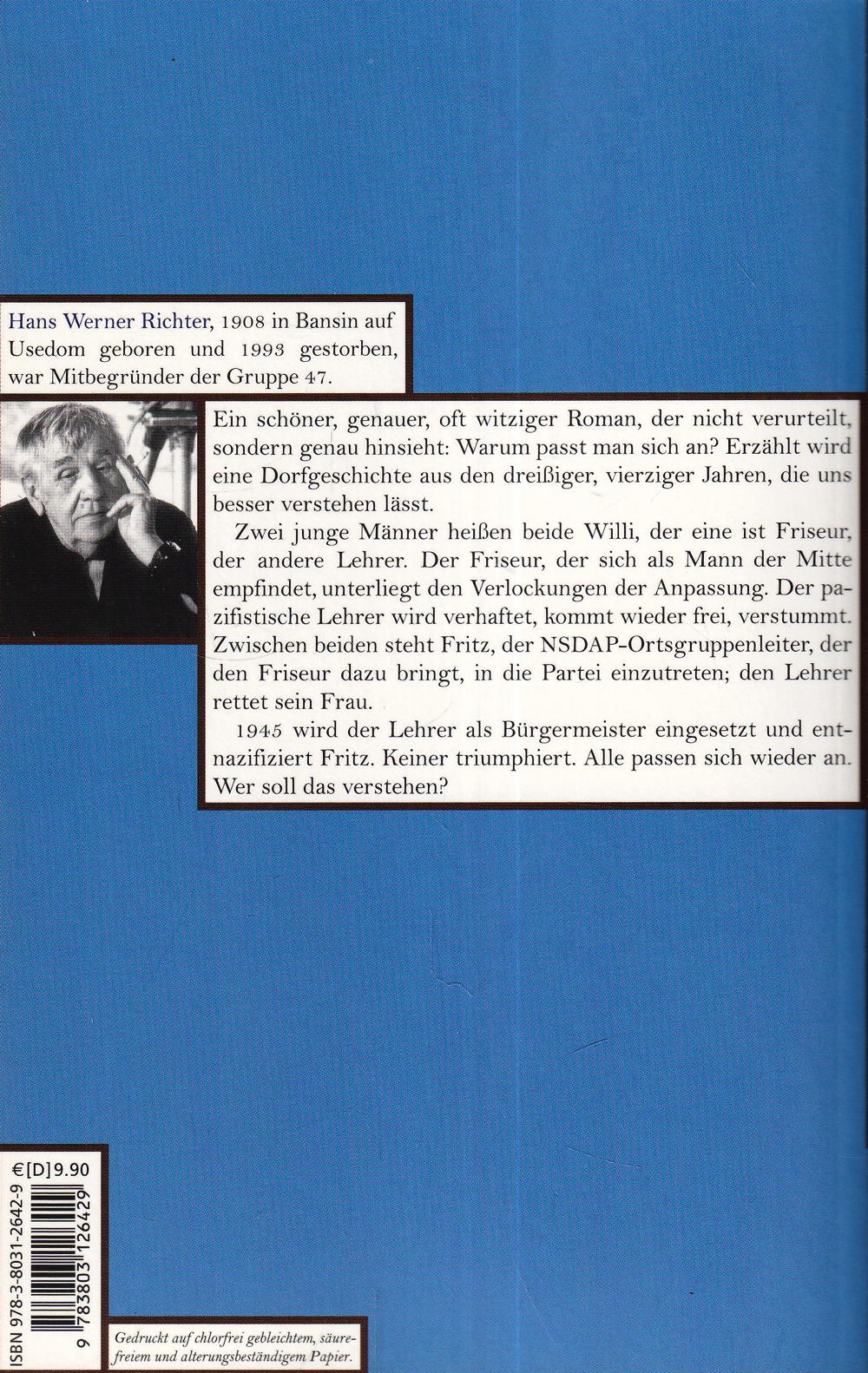 Der letzte Satz dieses anrührenden Buchs lautet: »Wer soll das alles verstehen?« Erzählt wird eine Dorfgeschichte aus den dreissiger, vierziger Jahren, die uns besser verstehen lässt. Zwei junge Männer heissen beide Willi, der eine ist Friseur, der andere Lehrer. Der Friseur, der sich als »Mann der Mitte, nach allen Seiten offen« empfindet, unterliegt den Verlockungen der Anpassung. Der pazifistische Lehrer wird verhaftet, kommt wieder frei, verstummt. Zwischen beiden steht Fritz, der NSDAP- Ortsgruppenleiter, der den Friseur dazu bringt, in die Partei einzutreten; den Lehrer rettet seine Frau. 1945 wird der Lehrer als Bürgermeister eingesetzt und entnazifiziert Fritz. Keiner triumphiert. Alle passen sich wieder an. Wer soll das verstehen?