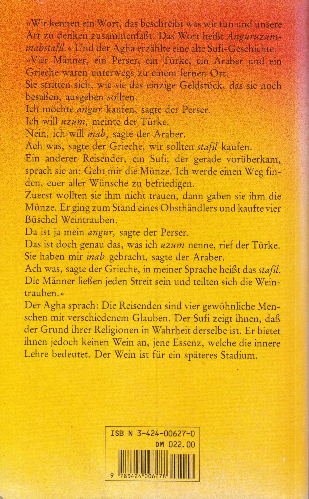 »Wir kennen ein Wort, das beschreibt was wir tun und unsere Art zu denken zusammenfasst. Das Wort heisst Anguruzuminabstafil. « Und der Agha erzählte eine alte Sufi-Geschichte, »Vier Männer, ein Perser, ein Türke, ein Araber und ein Grieche waren unterwegs zu einem fernen Ort. Sie stritten sich, wie sie das einzige Geldstück, das sie noch besassen, ausgeben sollten.