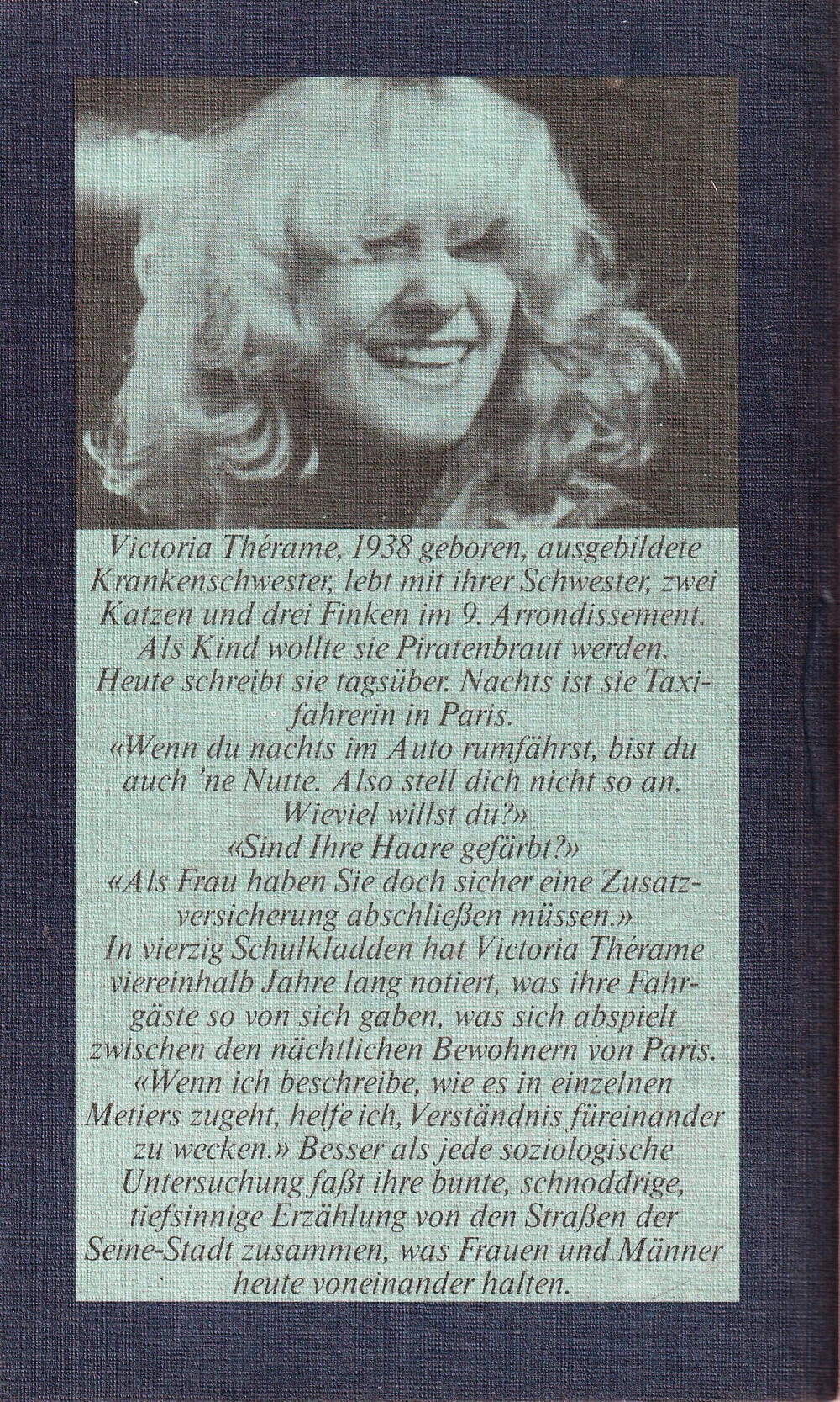 Heute schreibt sie tagsüber. Nachts ist sie Taxifahrerin in Paris. Wenn du nachts im Auto rumfährst, bist du auch 'ne Nutte. Also stell dich nicht so an. Wieviel willst du? Sind Ihre Haare gefärbt? Als Frau haben Sie doch sicher eine Zusatzversicherung abschliessen müssen.