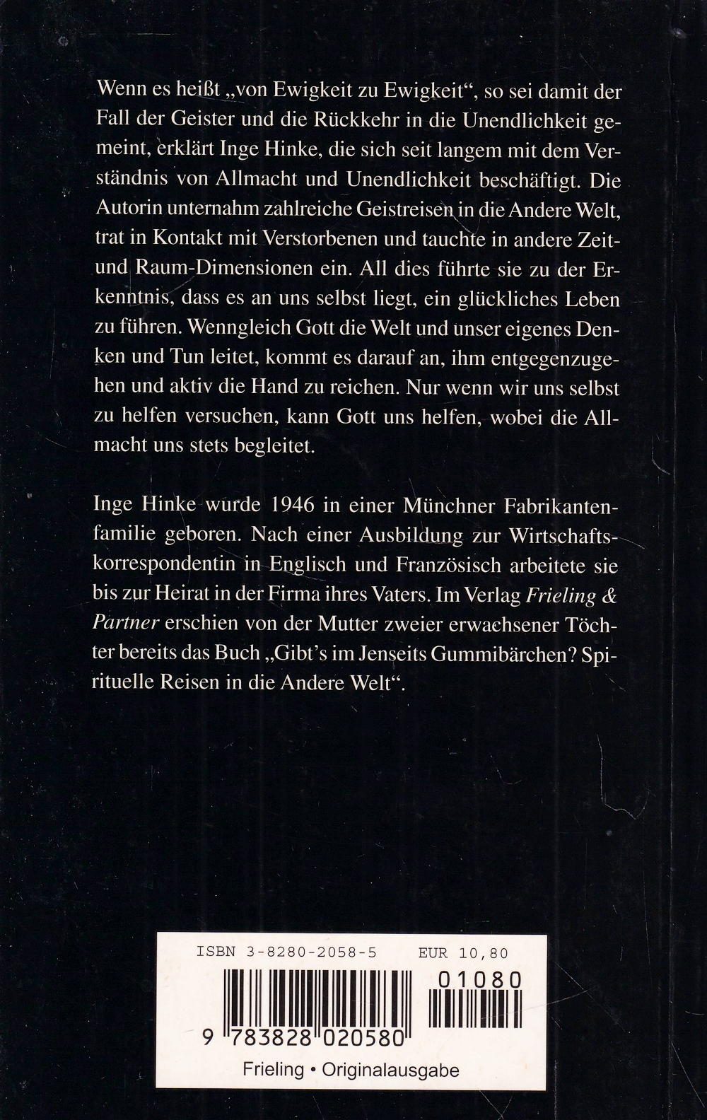 Inge Hinke wurde 1946 in einer Münchner Fabrikantenfamilie geboren. Nach einer Ausbildung zur Wirtschaftskorrespondentin in Englisch und Französisch arbeitete sie bis zur Heirat in der Firma ihres Vaters. Im Verlag Frieling & Partner erschien von der Mutter zweier erwachsener Töchter bereits das Buch „Gibt's im Jenseits Gummibärchen? Spirituelle Reisen in die Andere Welt“。