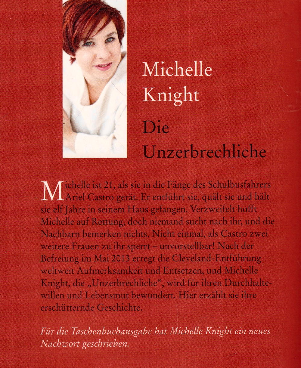 Michelle ist 21, als sie in die Fänge des Schulbusfahrers Ariel Castro gerät. Er entführt sie, quält sie und hält sie elf Jahre in seinem Haus gefangen. Verzweifelt hofft Michelle auf Rettung, doch niemand sucht nach ihr, und die Nachbarn bemerken nichts. Nicht einmal, als Castro zwei weitere Frauen zu ihr sperrt - unvorstellbar! Nach der Befreiung im Mai 2013 erregt die Cleveland-Entführung weltweit Aufmerksamkeit und Entsetzen, und Michelle Knight, die "Unzerbrechliche", wird für ihren Durchhaltewillen und Lebensmut bewundert. Hier erzählt sie ihre erschütternde Geschichte.