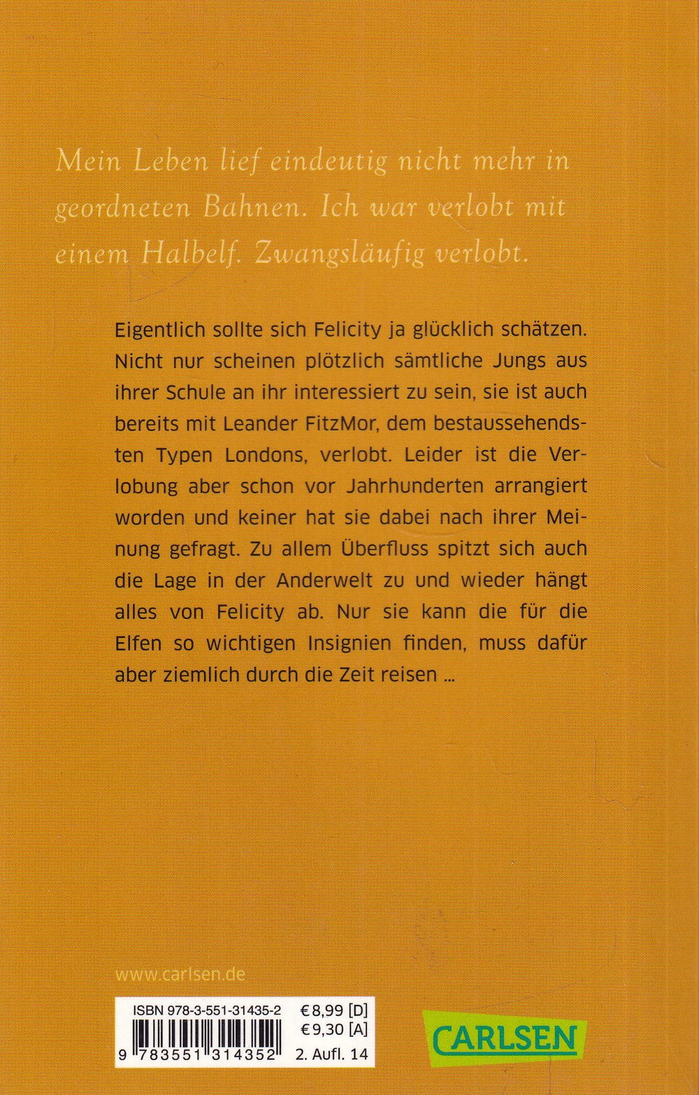 Eigentlich sollte sich Felicity ja glücklich schätzen. Nicht nur scheinen plötzlich sämtliche Jungen aus ihrer Schule an ihr interessiert zu sein, sie ist auch bereits mit dem bestaussehendsten Typen Londons verlobt. Nur leider ist die Verlobung schon vor Jahrhunderten arrangiert worden und ihr Zukünftiger der etwas zu charmante Halbelf Leander FitzMor, der viel zu vielen Frauen den Kopf verdreht. Felicity kann sich einfach nicht entscheiden, ob sie ihn lieber schlagen oder ihm doch endlich den alles verändernden Kuss geben soll. Zu allem Überfluss spitzt sich auch die Lage in der Anderwelt zu und wieder hängt alles von Felicity ab. Nur sie kann die für die Elfen so wichtigen Insignien finden, muss dafür aber ziemlich durch die Zeit reisen...