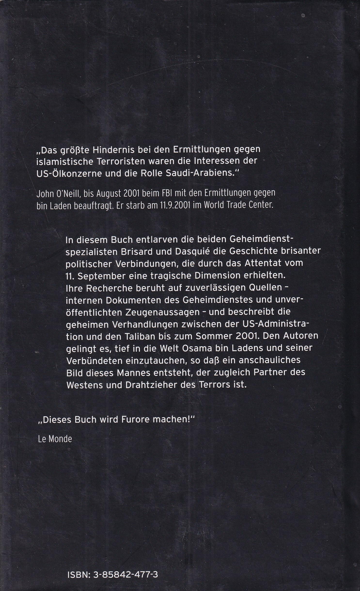 Jean-Charles Brisard und Guillaume Dasquié, Übersetzerinnen: Karola Bartsch, Eliane Hagedorn und Jutta Kaspar, Die verbotene Wahrheit. Die Verstrickungen der USA mit Osama bin Laden, Erstausgabe 2002, ISBN 3858424773, 284 Seiten