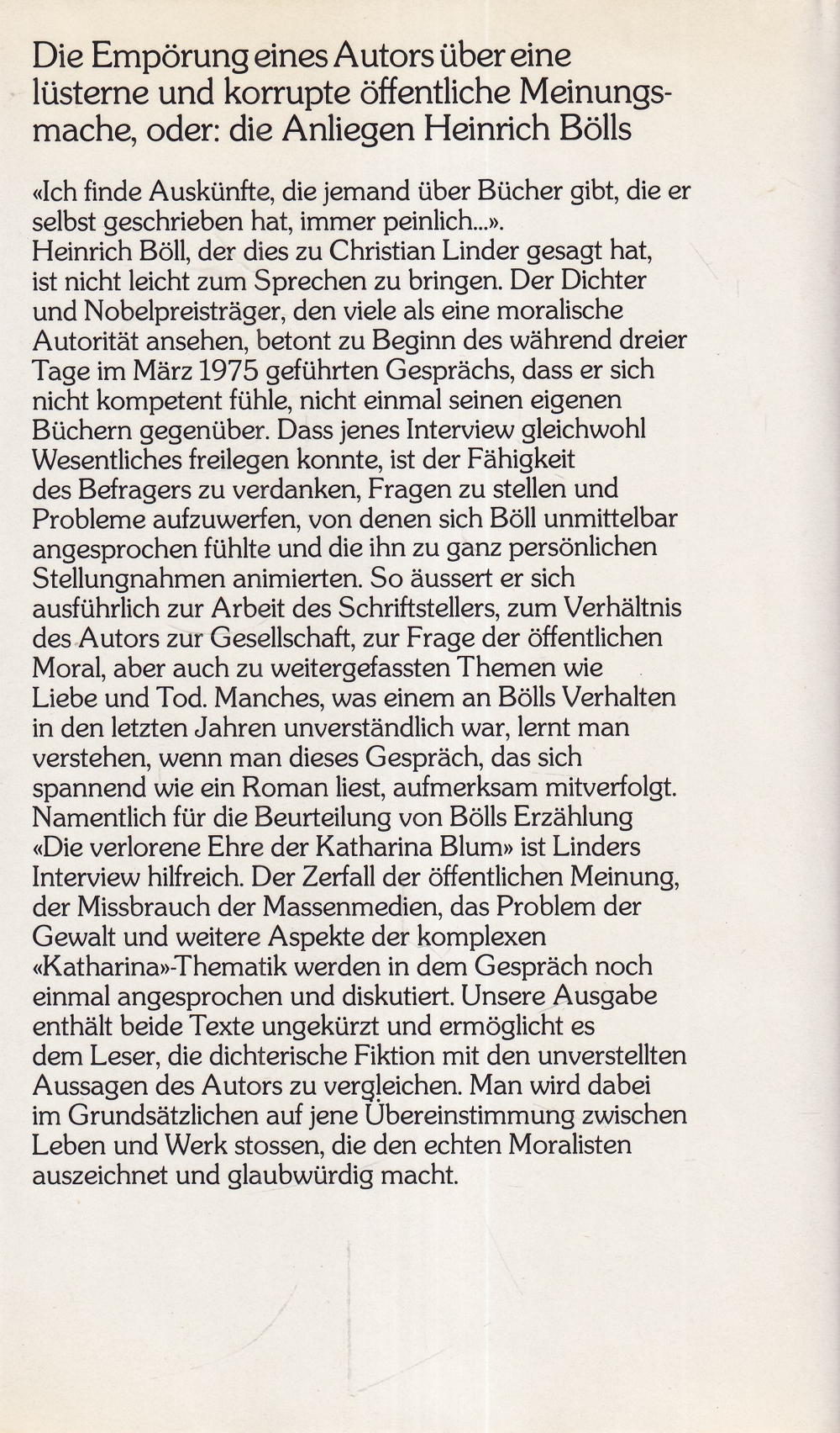 Namentlich für die Beurteilung von Bölls Erzählung «Die verlorene Ehre der Katharina Blum» ist Linders Interview hilfreich. Der Zerfall der öffentlichen Meinung, der Missbrauch der Massenmedien, das Problem der Gewalt und weitere Aspekte der komplexen «Katharina»-Thematik werden in dem Gespräch noch einmal angesprochen und diskutiert. Unsere Ausgabe enthält beide Texte ungekürzt und ermöglicht es dem Leser, die dichterische Fiktion mit den unverstellten Aussagen des Autors zu vergleichen. Man wird dabei im Grundsätzlichen auf jene Übereinstimmung zwischen Leben und Werk stossen, die den echten Moralisten auszeichnet und glaubwürdig macht.