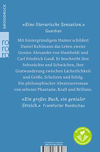 Mit hintergründigem Humor schildert Daniel Kehlmann das Leben zweier Genies: Alexander von Humboldt und Carl Friedrich Gauss. Er beschreibt ihre Sehnsüchte und Schwächen, ihre Gratwanderung zwischen Lächerlichkeit und Grösse, Scheitern und Erfolg. Ein philosophischer Abenteuerroman von seltener Phantasie, Kraft und Brillanz.