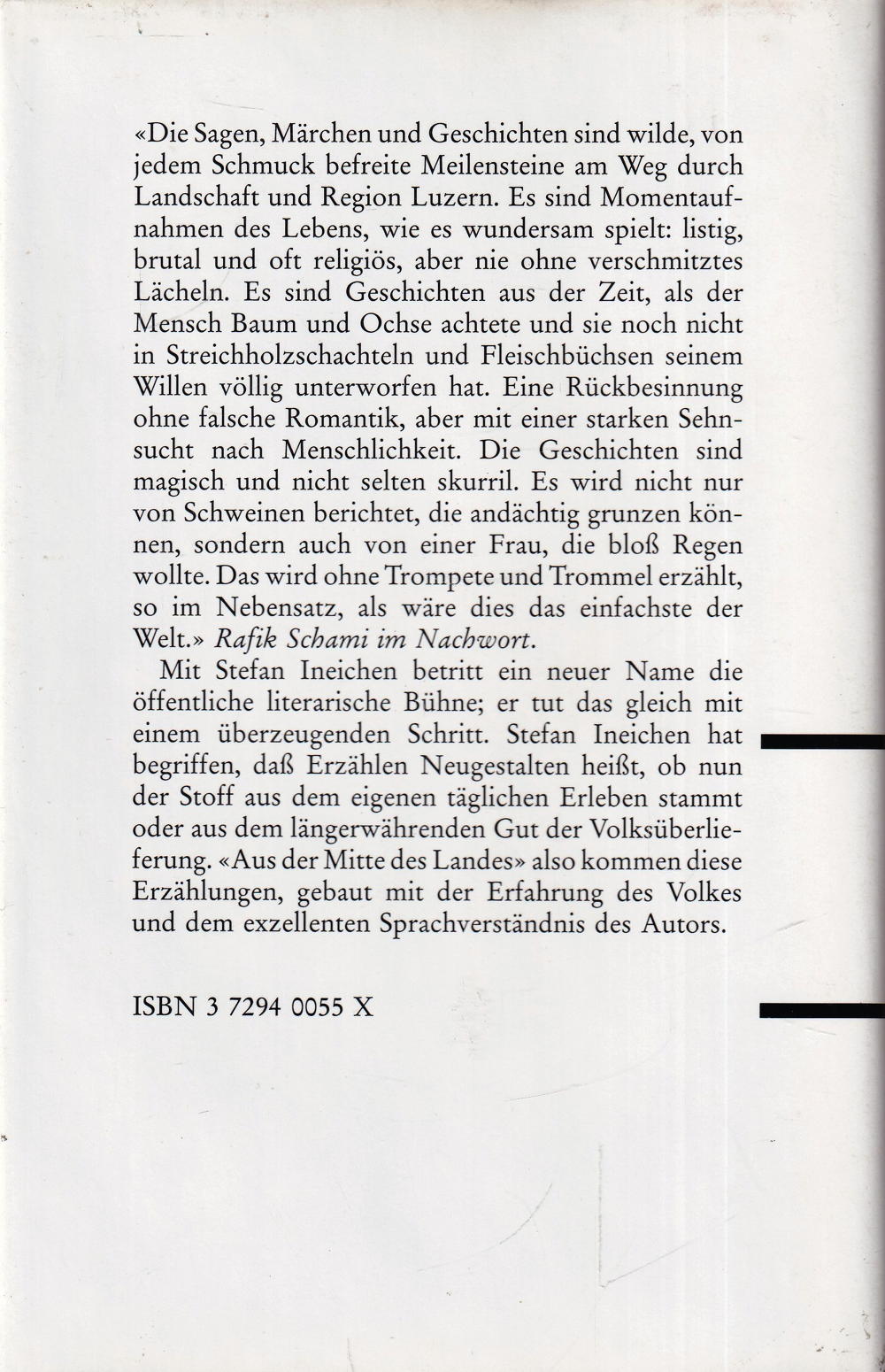 Mit Stefan Ineichen betritt ein neuer Name die öffentliche literarische Bühne; er tut das gleich mit einem überzeugenden Schritt. Stefan Ineichen hat begriffen, dass Erzählen Neugestalten heisst, ob nun der Stoff aus dem eigenen täglichen Erleben stammt oder aus dem längerwährenden Gut der Volksüberlieferung. «Aus der Mitte des Landes» also kommen diese Erzählungen, gebaut mit der Erfahrung des Volkes und dem exzellenten Sprachverständnis des Autors.>>